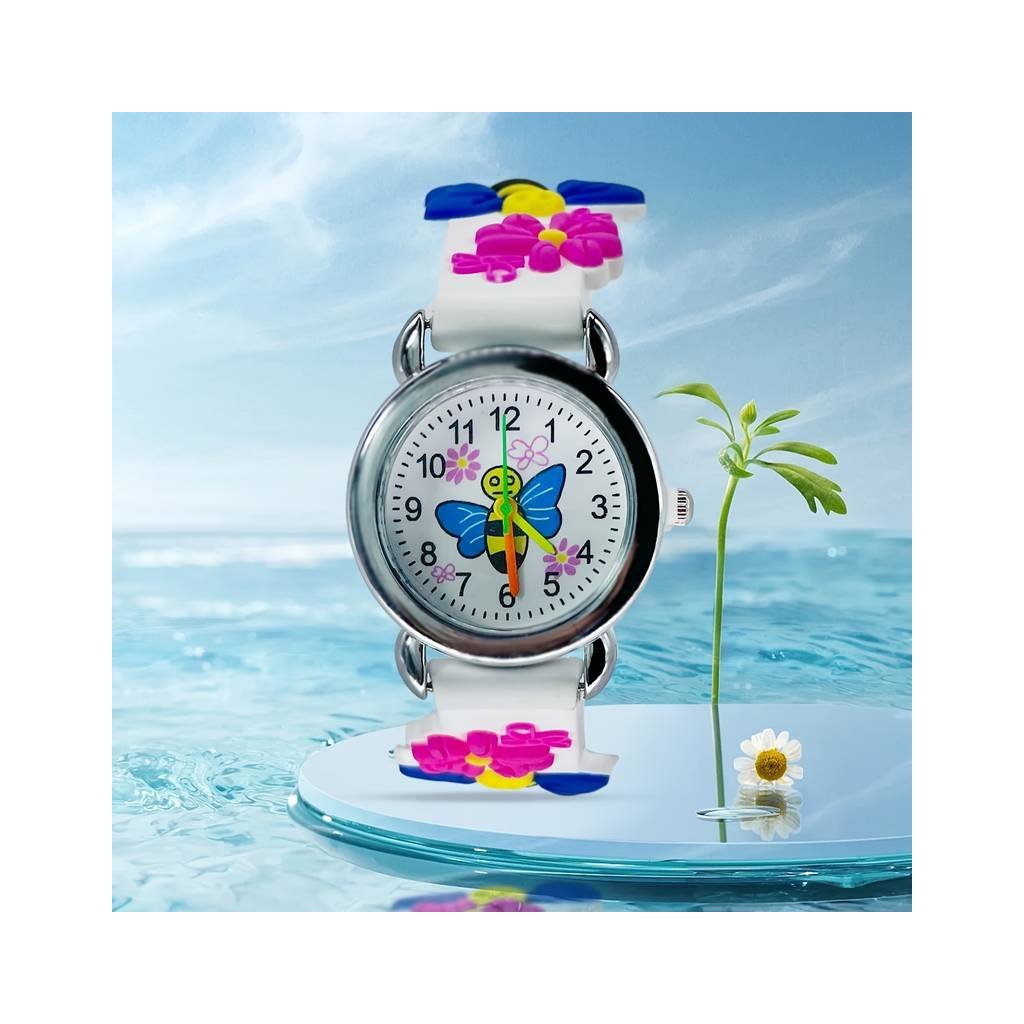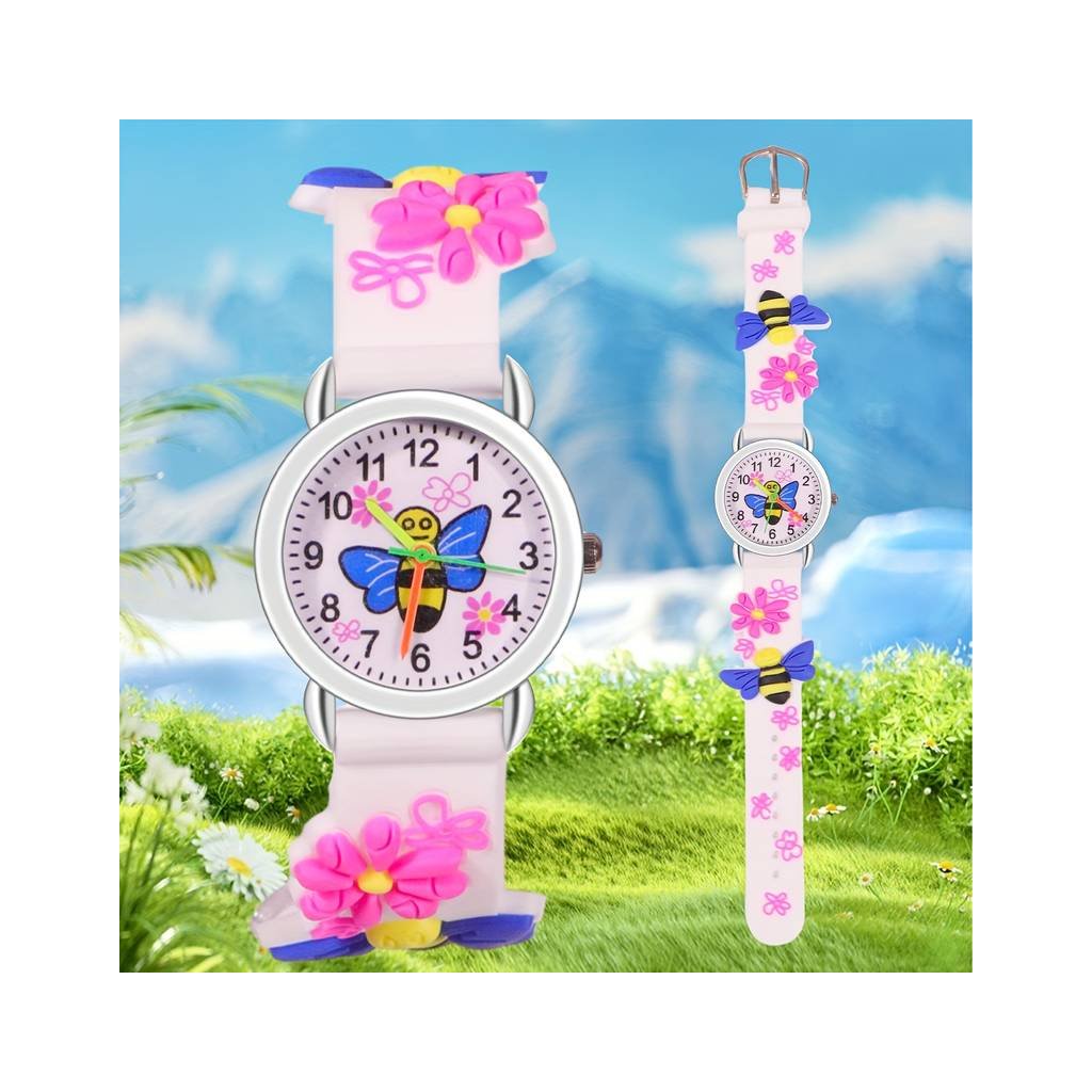 Roztomilé hodinky s motivem včeličky. Hodinky mají barevný ciferník a ručičky v duhových barvách. Řemínek je vyroben z měkkého a pohodlného silikonu.