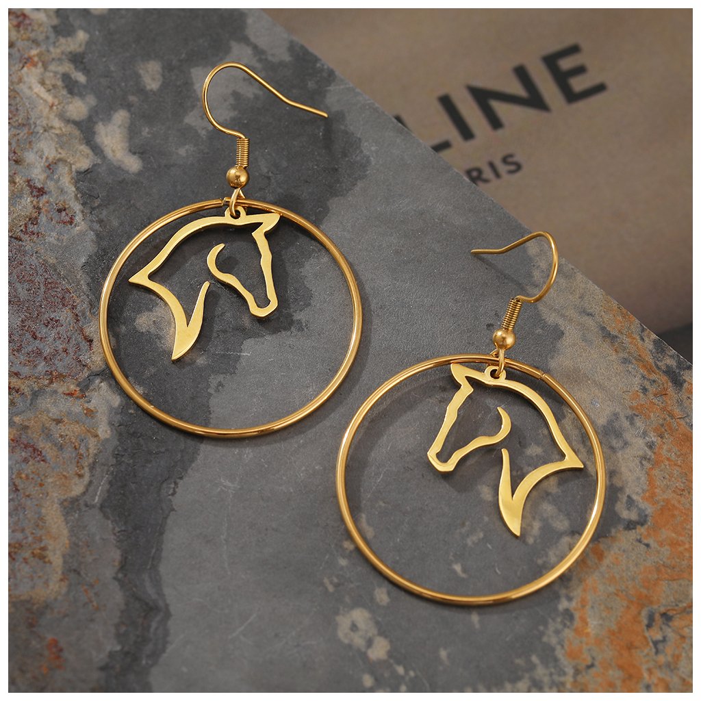 Kruhové náušnice na háček - koňská hlava, zlatá ocel