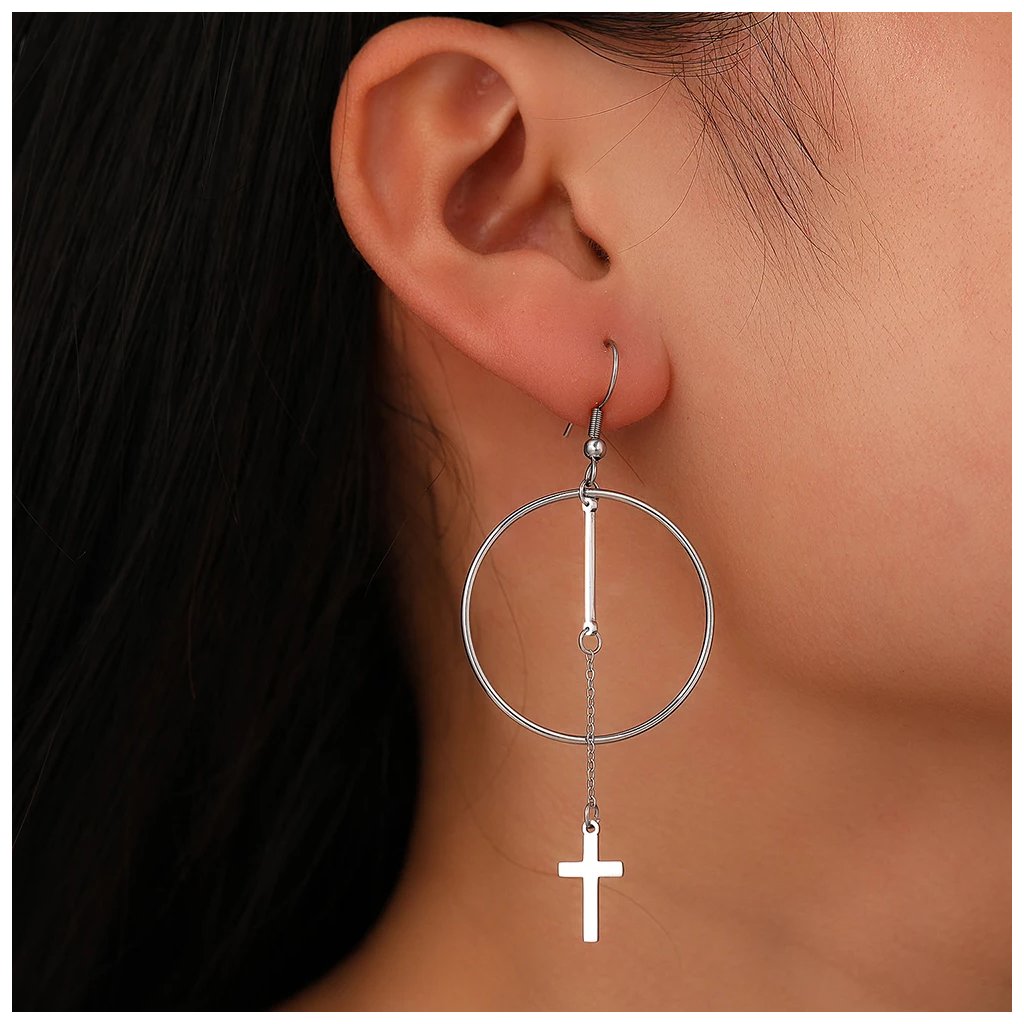 Kruhové náušnice na háček - křížek, stříbrná ocel