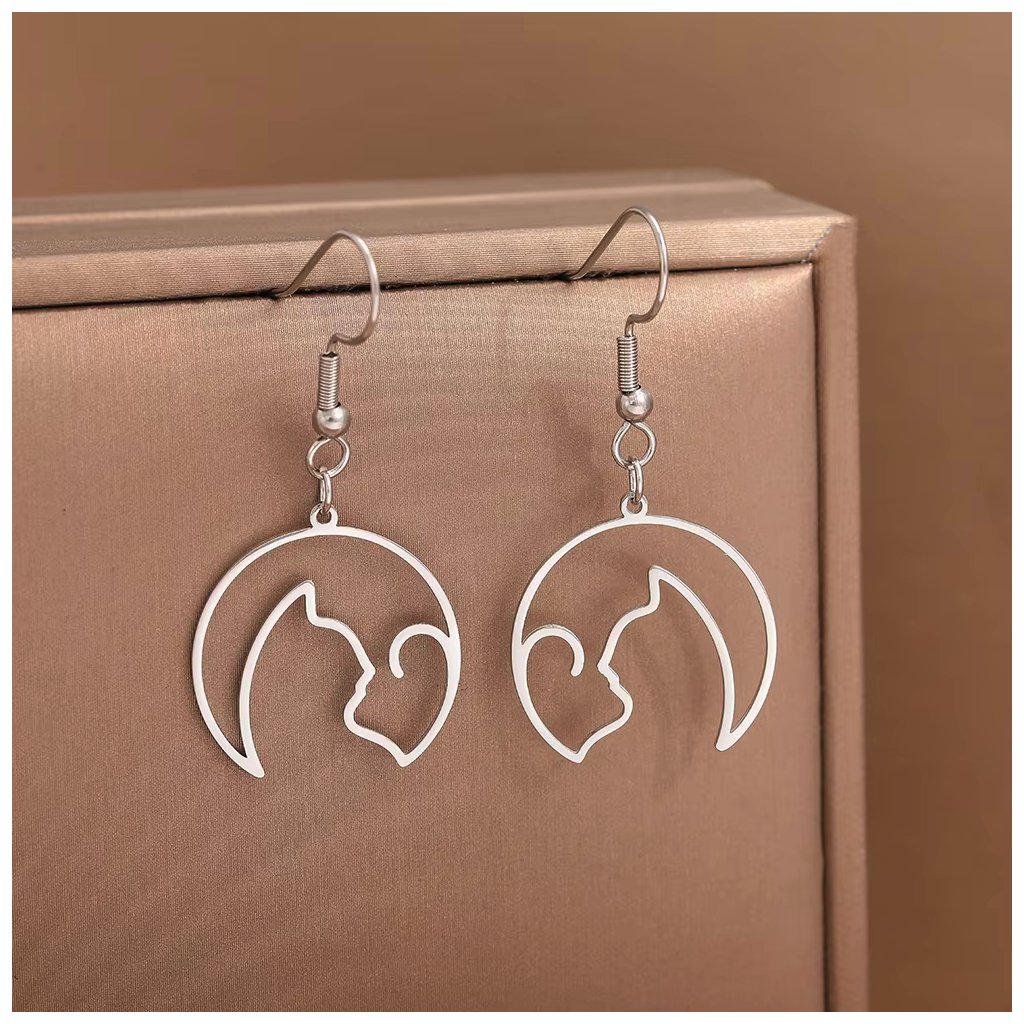 Náušnice na háček - kočka a měsíc, stříbrná ocel