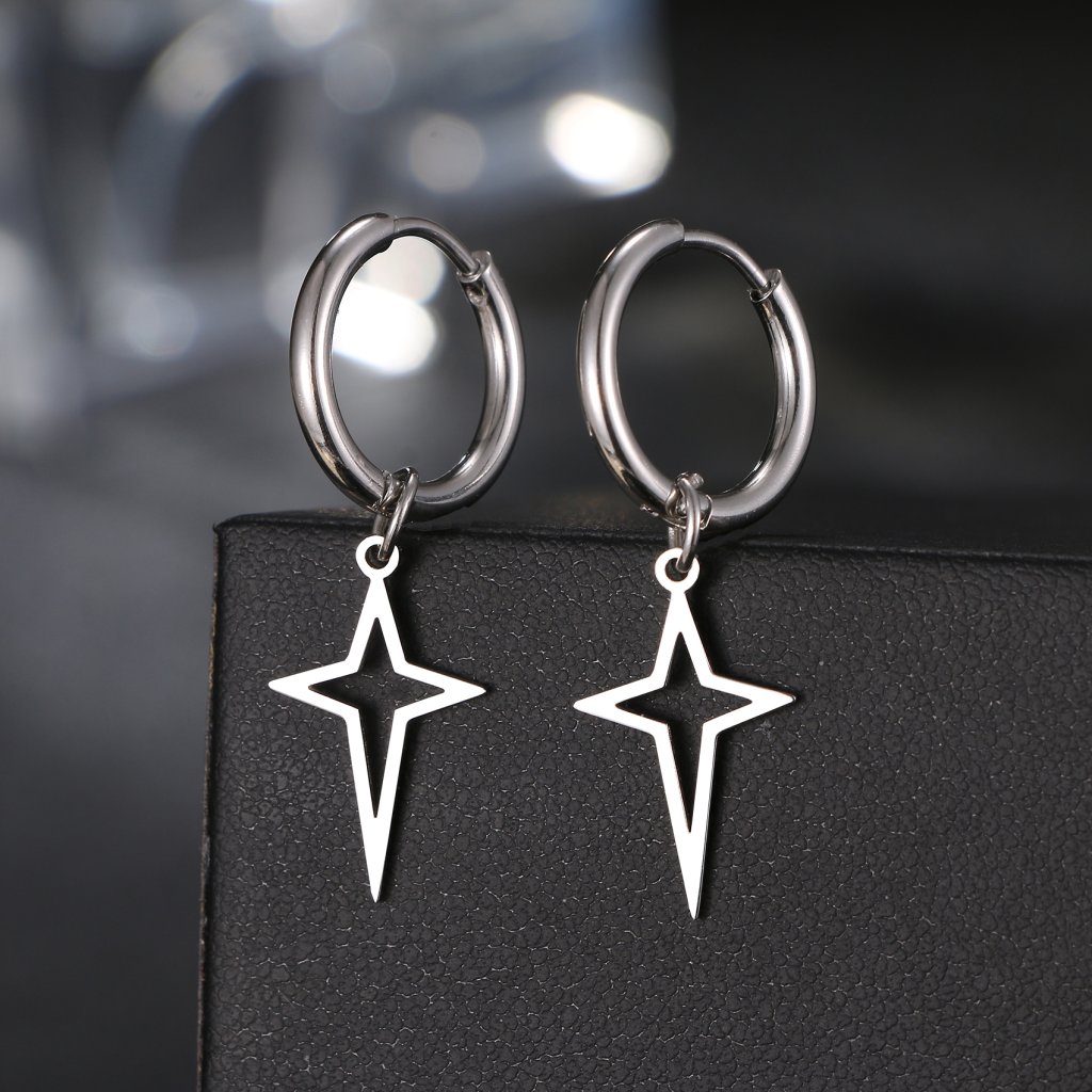 Ocelové kruhové náušnice - čtyřcípá hvězda