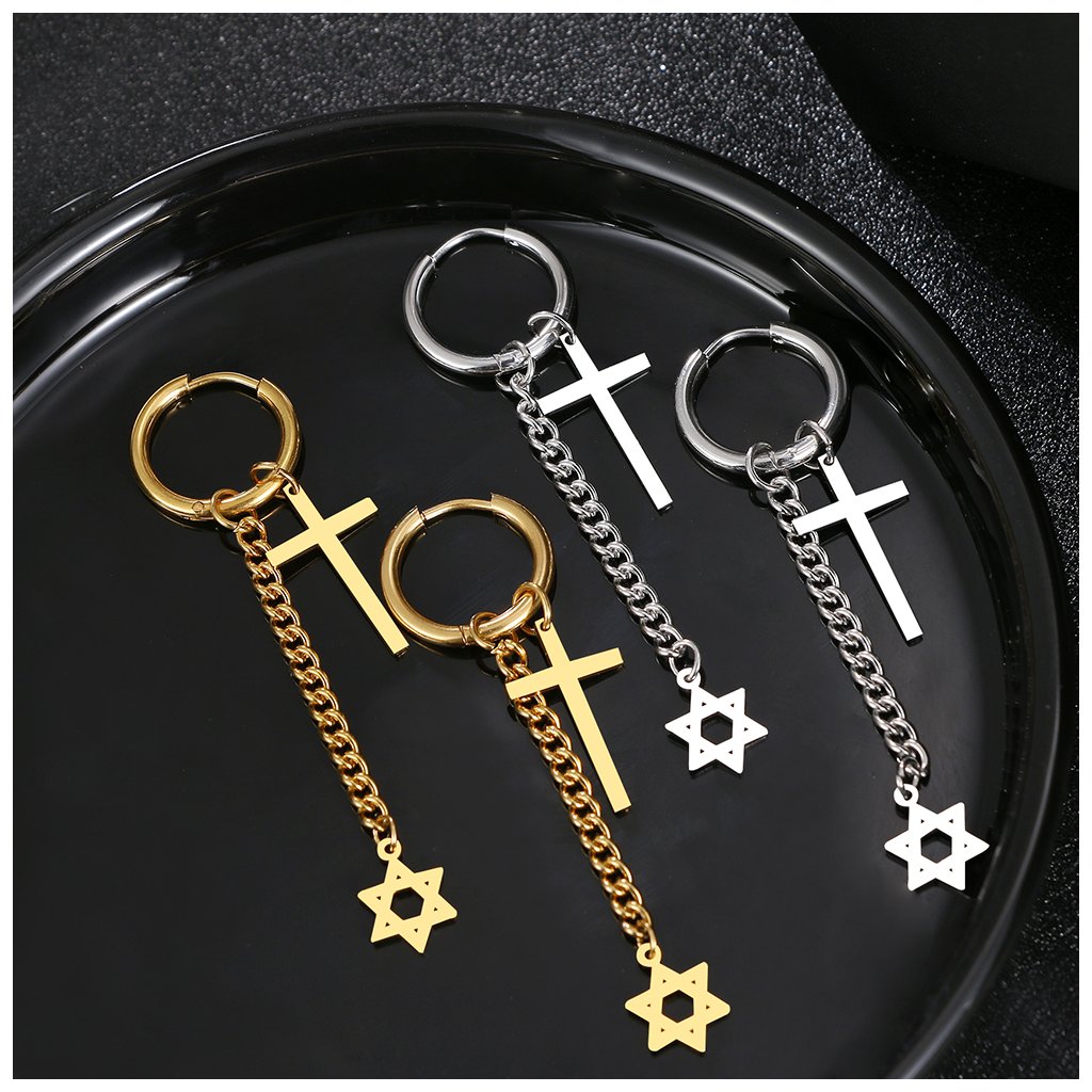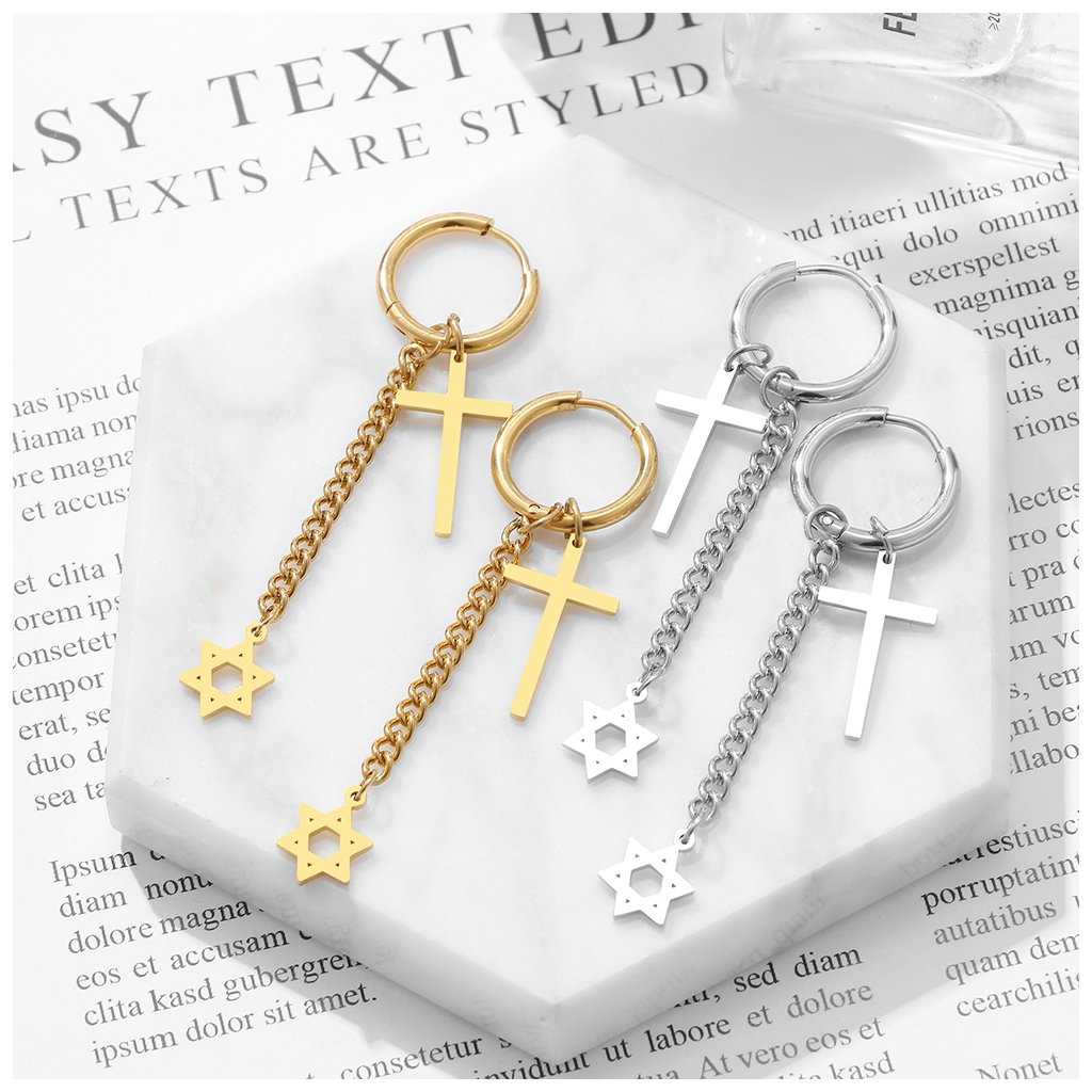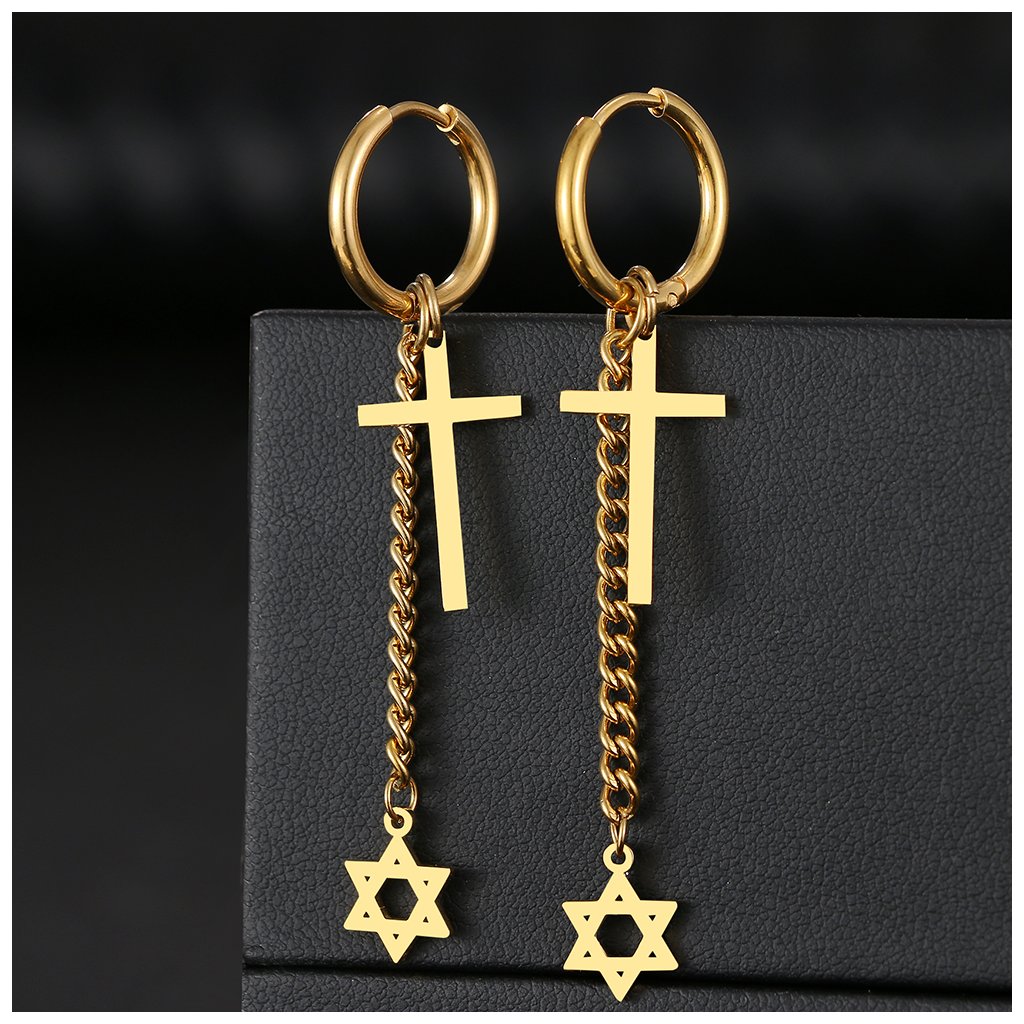 Ocelové kruhové náušnice - křížek a židovská hvězda