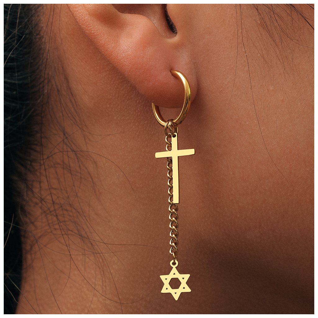 Kombinace křížku a židovské hvězdy na ocelových kruhových náušnicích může naznačovat snahu o propojení a vzájemnou toleranci mezi různými náboženskými tradicemi nebo může vyjadřovat osobní víru, identitu nebo důležitost náboženských hodnot. Opět je důležité si uvědomit, že významy šperků jsou subjektivní a mohou se lišit mezi různými lidmi. Interpretace a symbolika takových náušnic závisí na osobních přesvědčeních a hodnotách nositele.