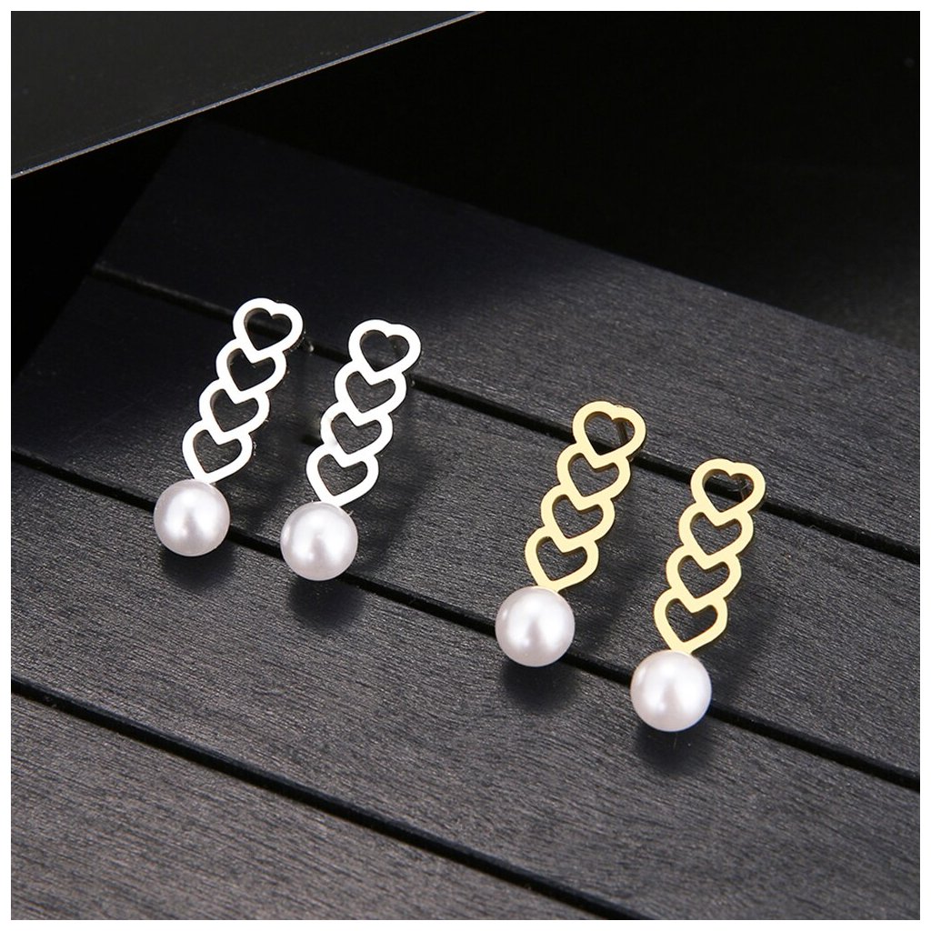 Ocelové puzetové náušnice - čtyři srdce s perlou