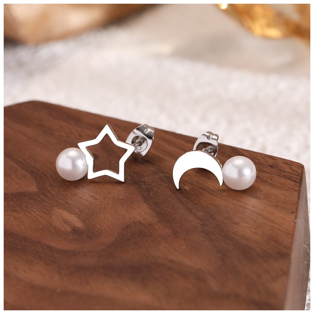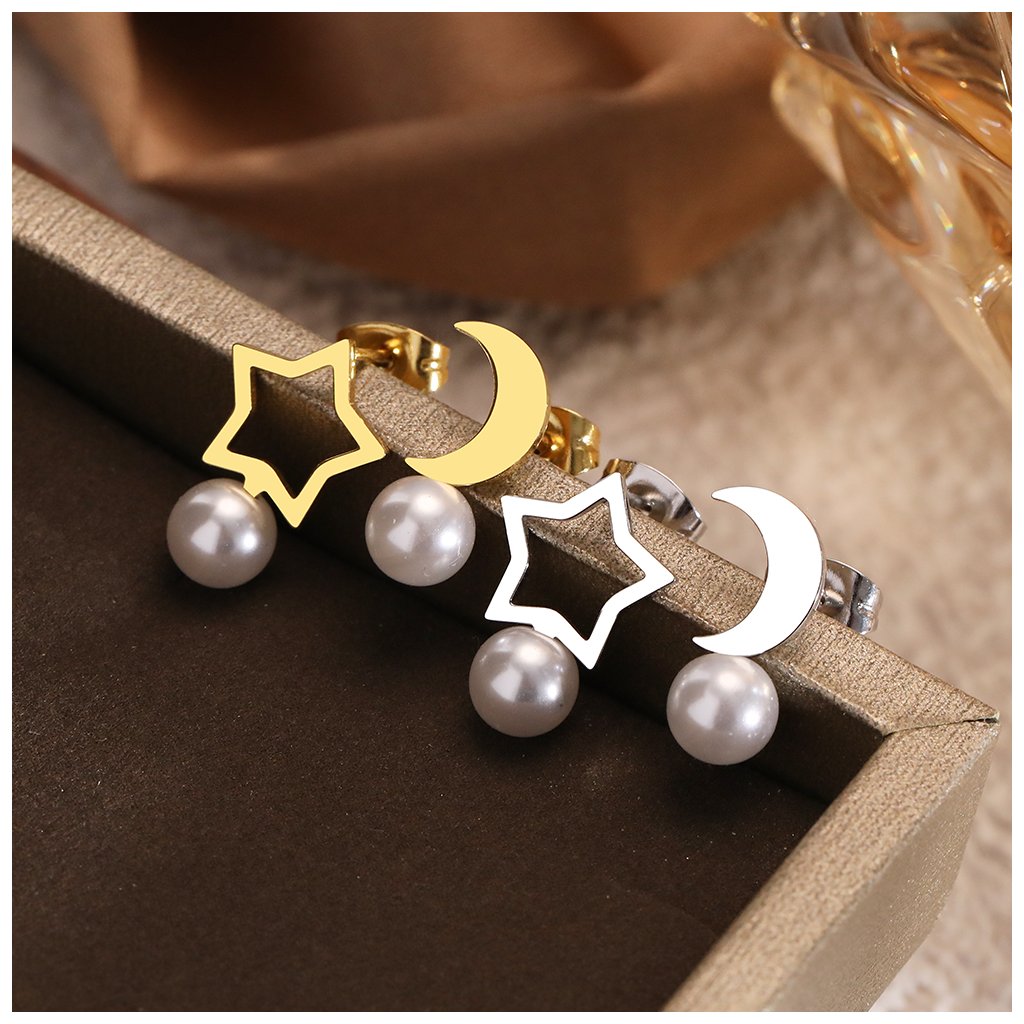 Ocelové puzetové náušnice - měsíc a hvězda s perlou