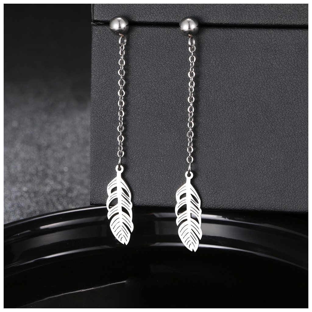 Ocelové puzetové náušnice s řetízkem a peckou - peříčko