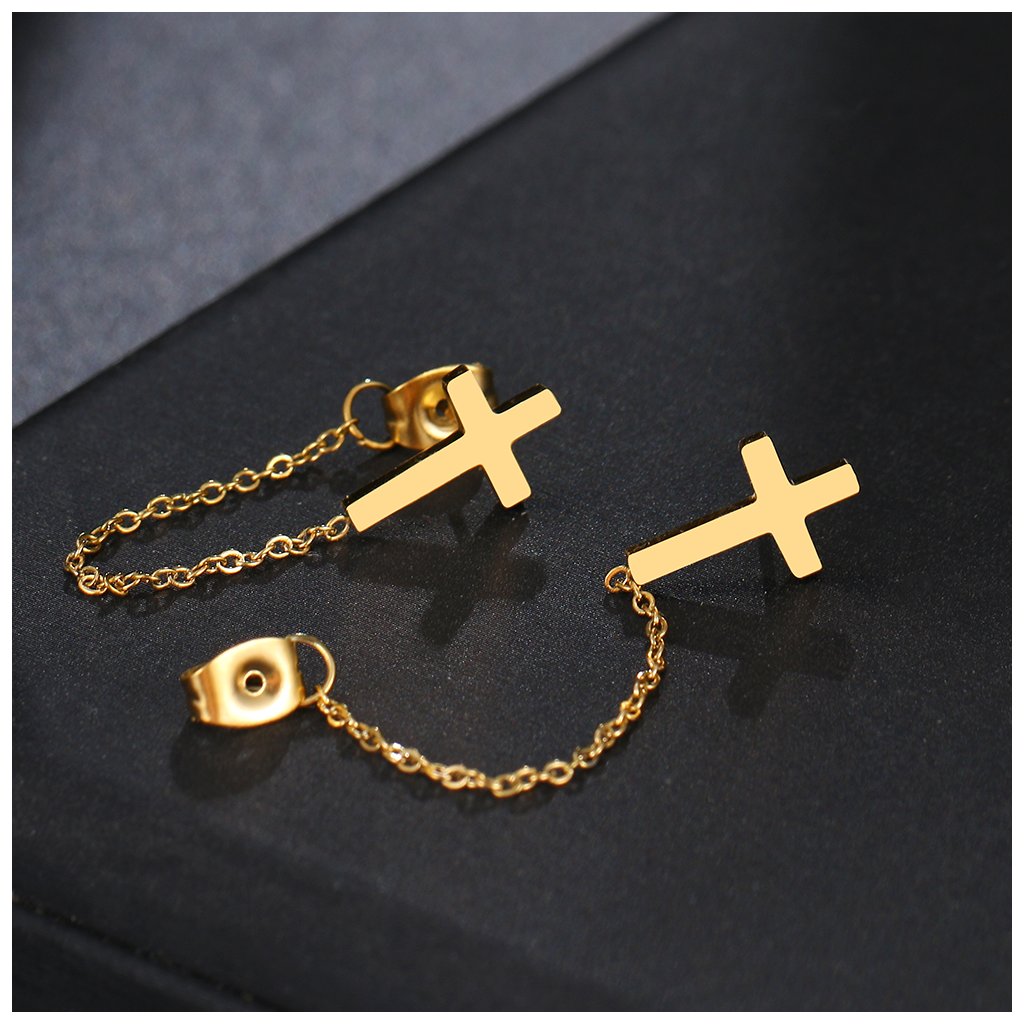 Ocelové puzetové náušnice s řetízkem - křížek Victory