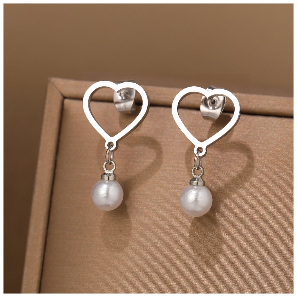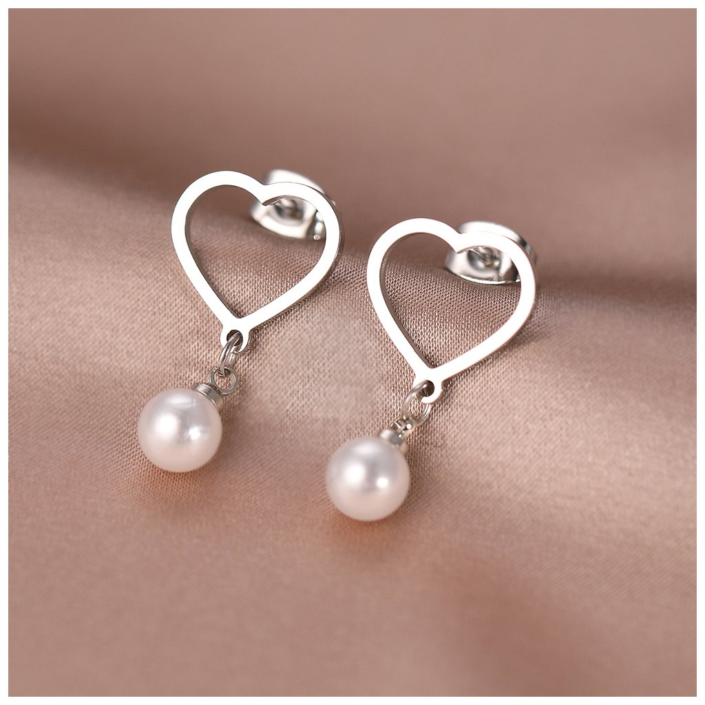 Ocelové puzetové náušnice - srdce s visací perlou