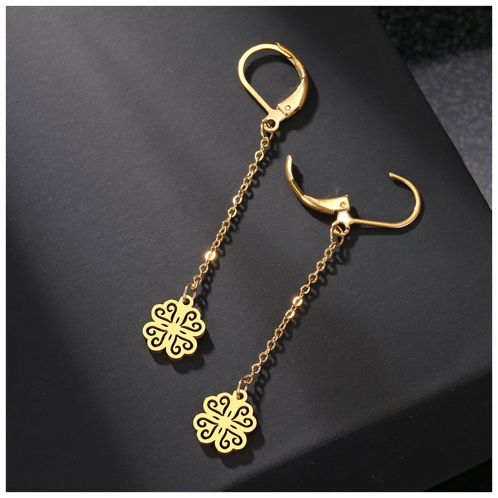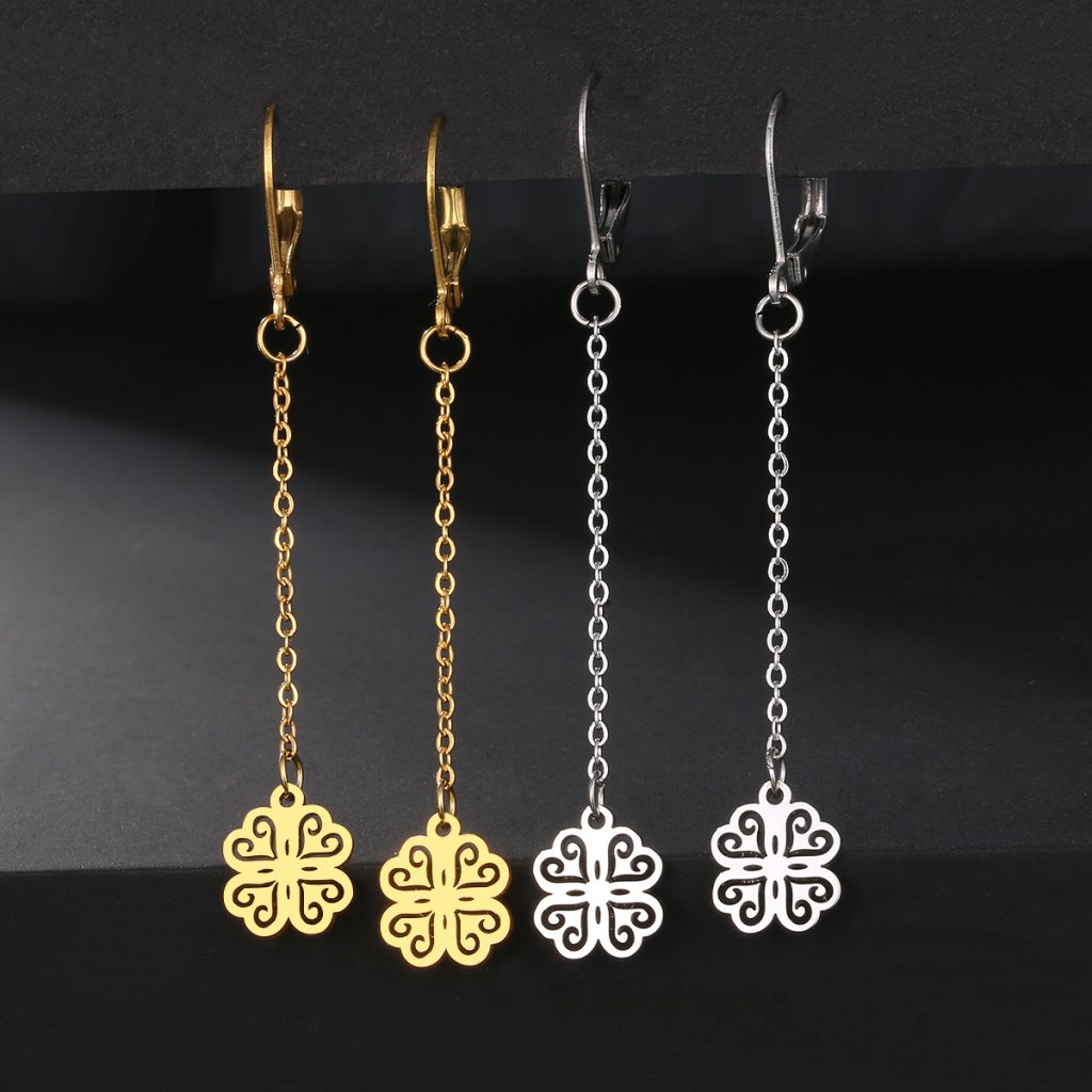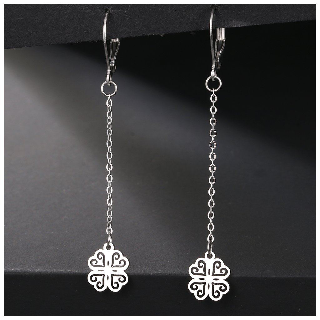 Ocelové visací náušnice s řetízkem - čtyřlístek Suerte