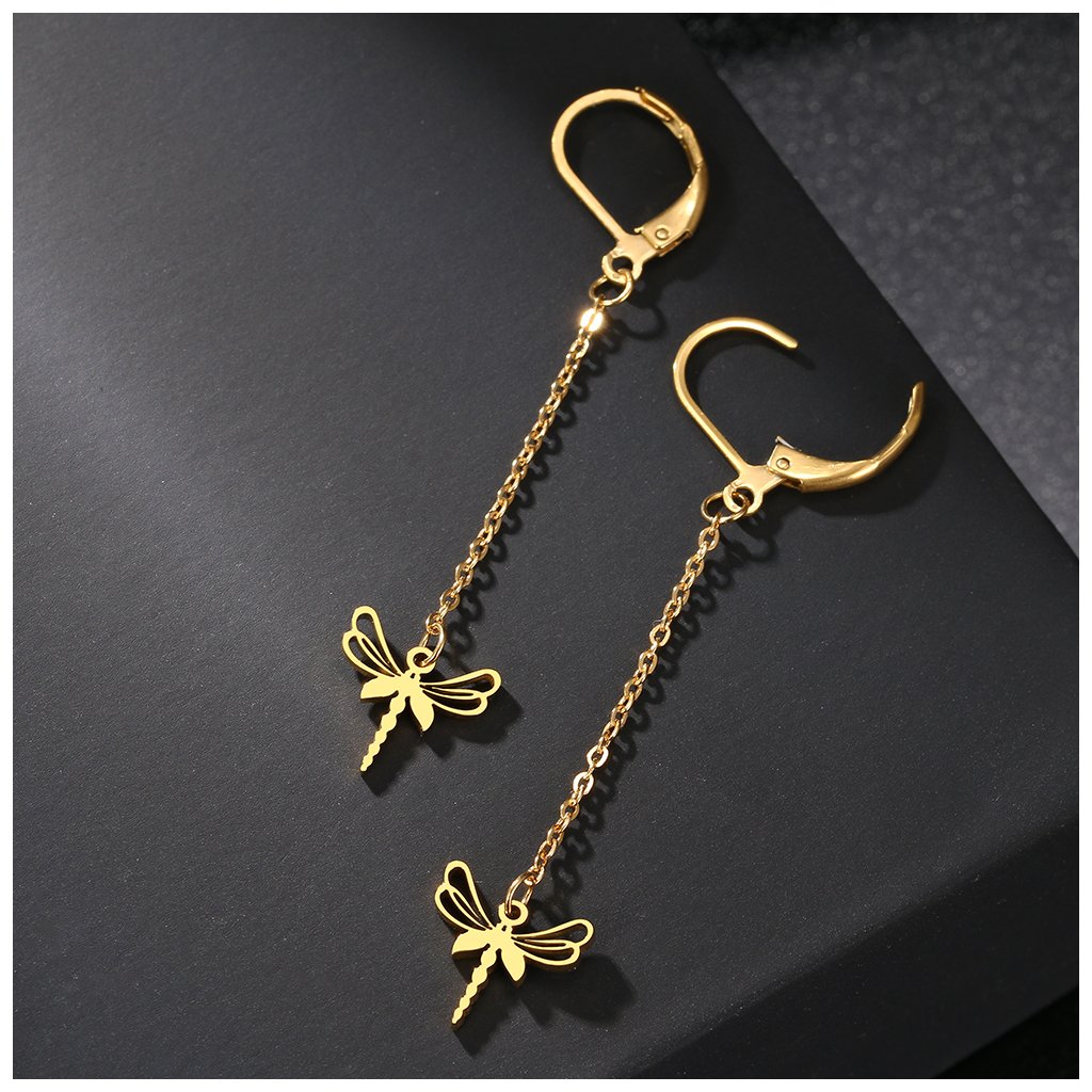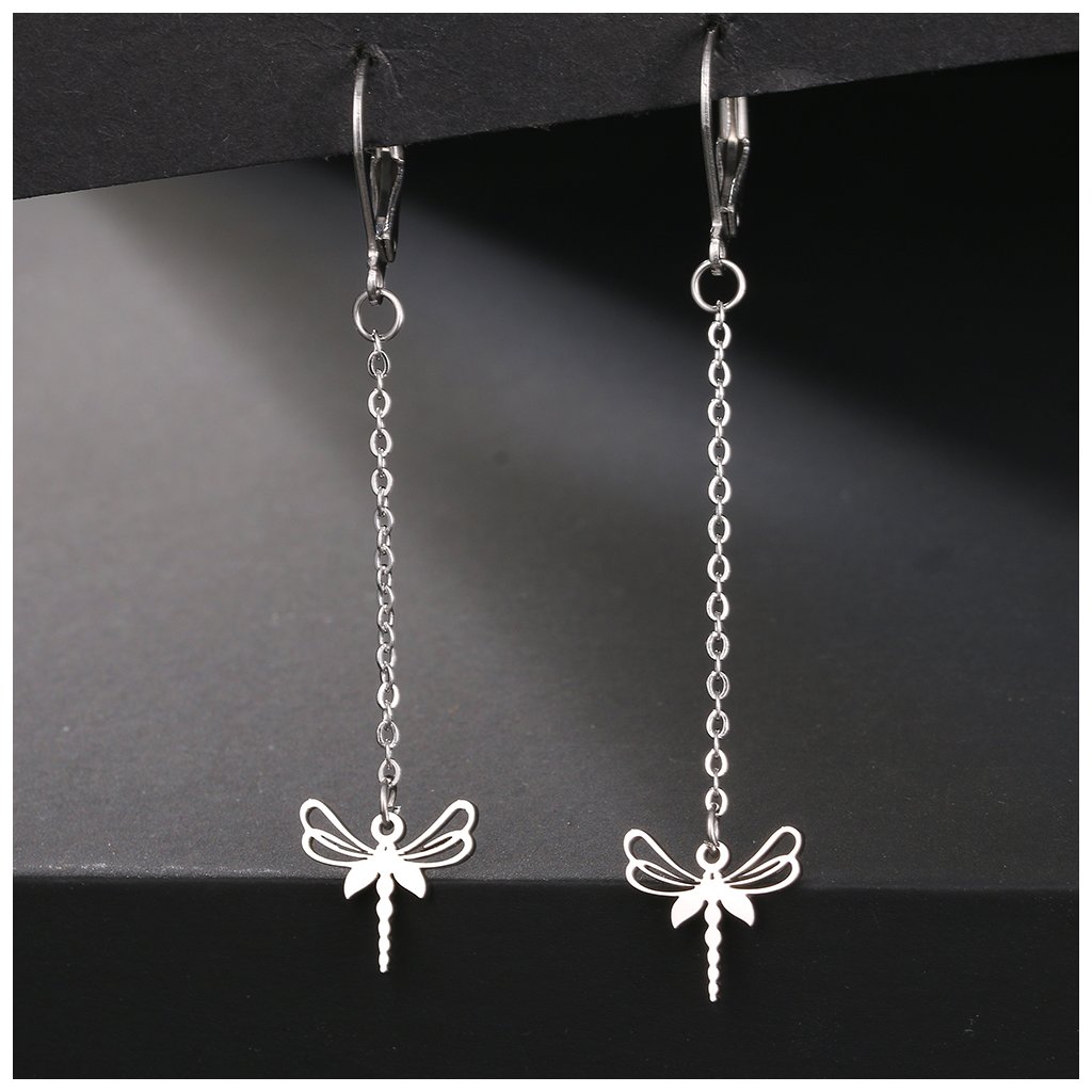 Ocelové visací náušnice s řetízkem ve tvaru vážky jsou symbolickým šperkem, který přináší poselství štěstí a transformace.