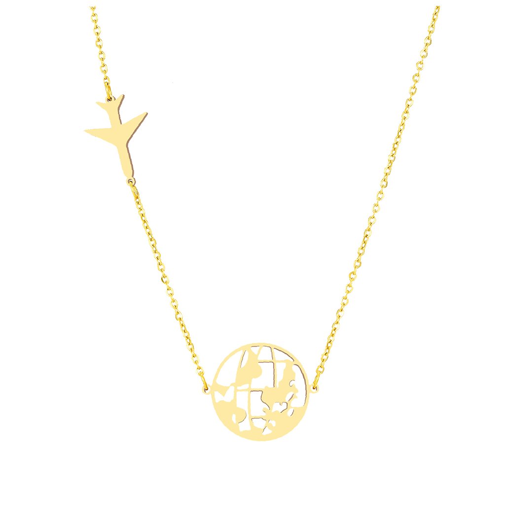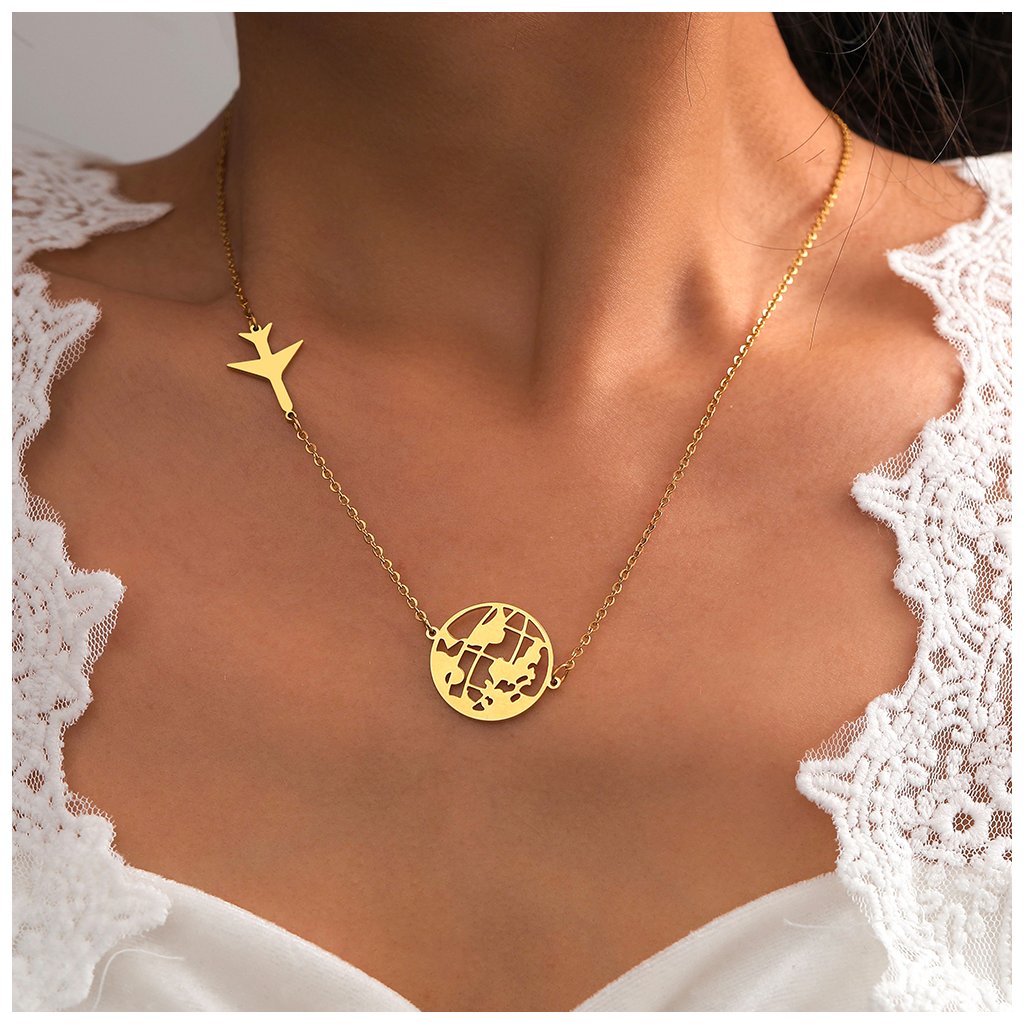 Ocelový řetízek s přívěskem mapa světa a letadlo je šperk, který má mnoho významů.