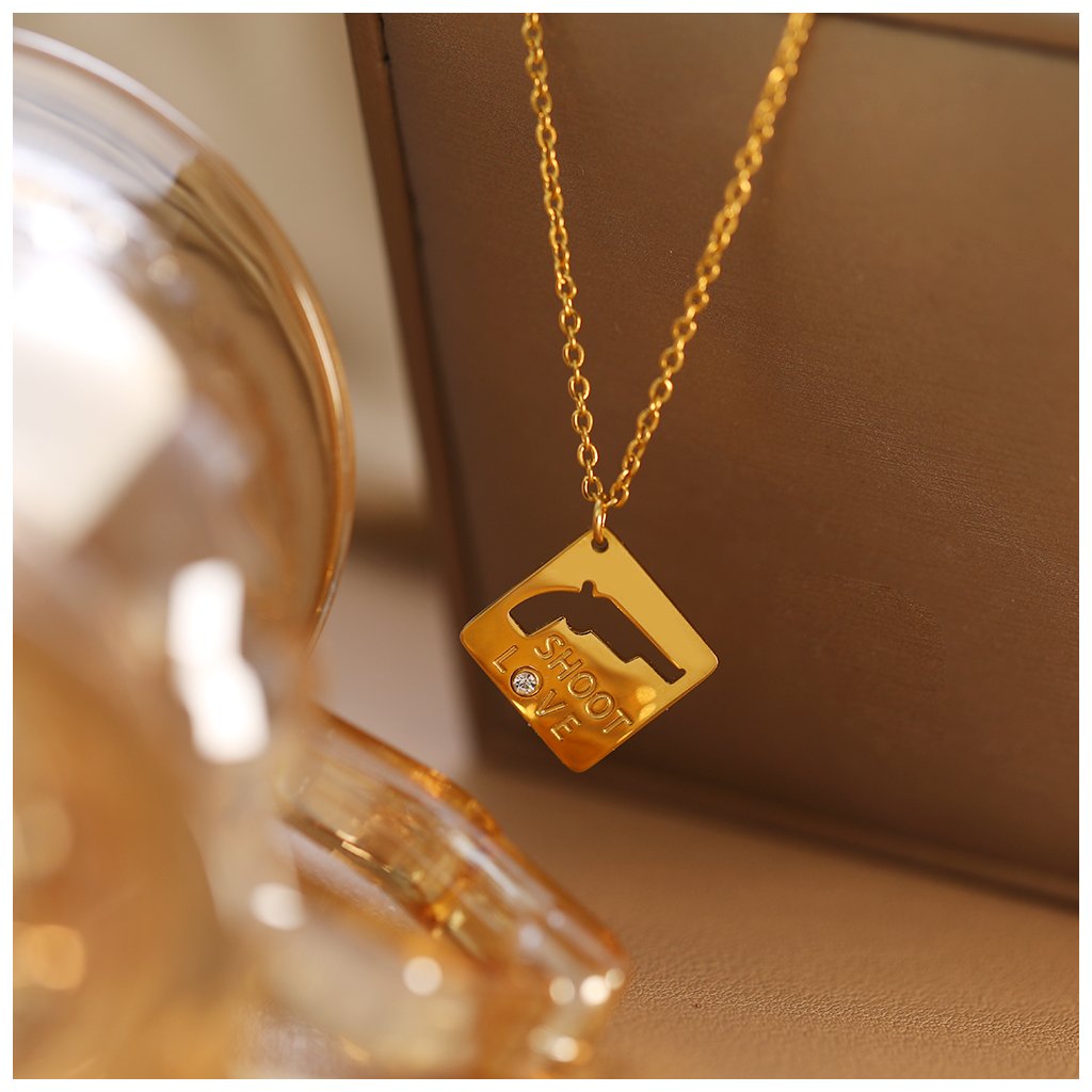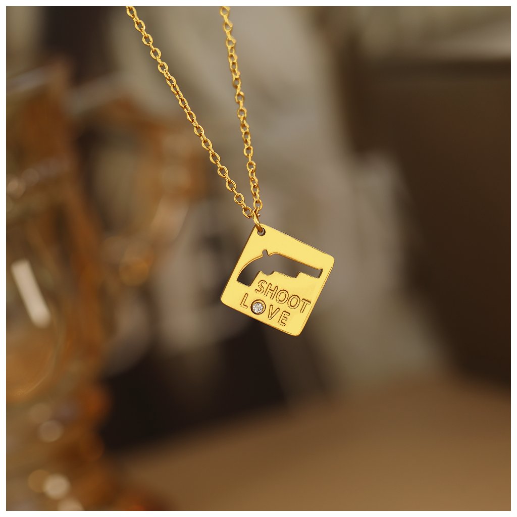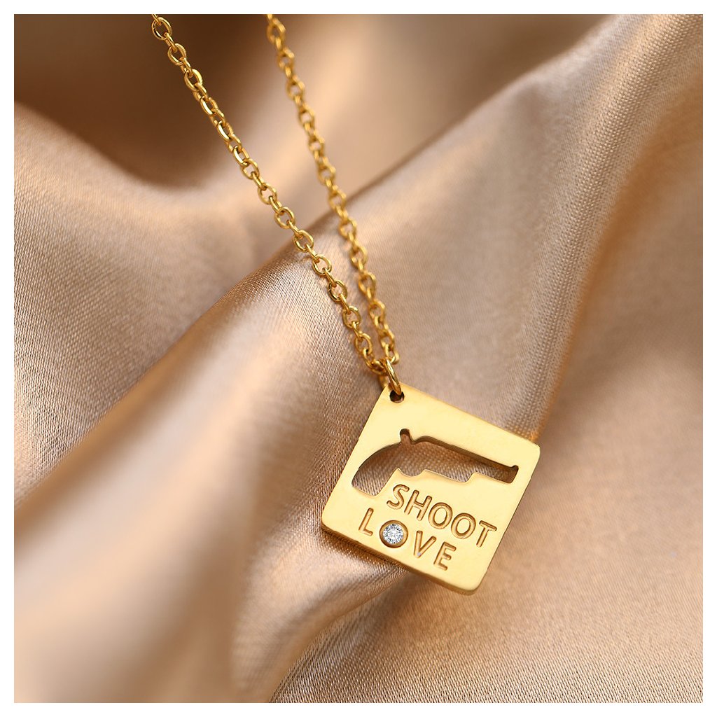 - Pokud jste romantický člověk a hledáte symbol lásky a náklonnosti, můžete nosit ocelový řetízek s přívěskem revolver s nápisem Shoot Love.