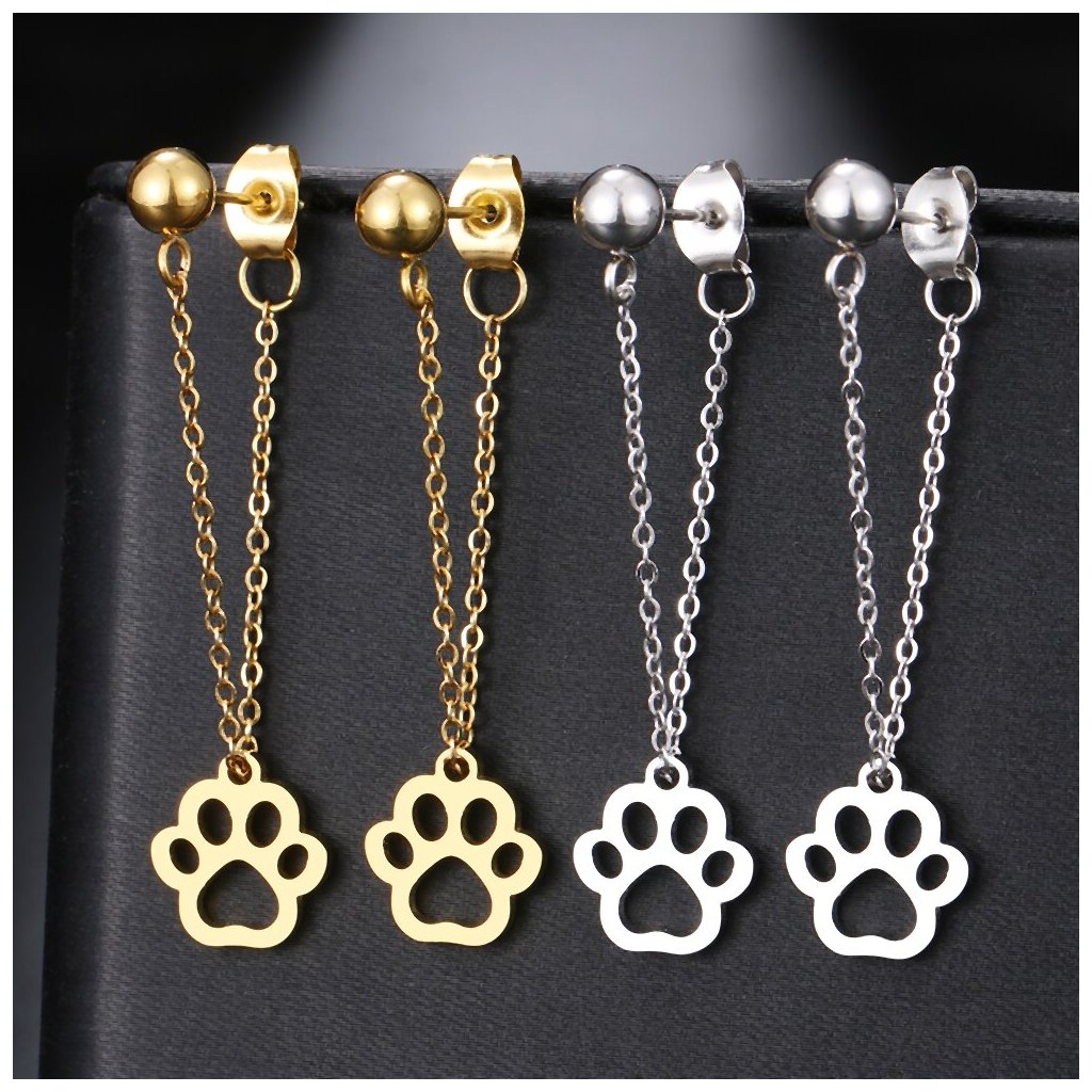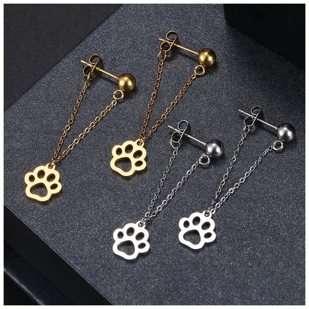 Puzetové náušnice s řetízkem a s peckou - psí tlapka, zlatá ocel