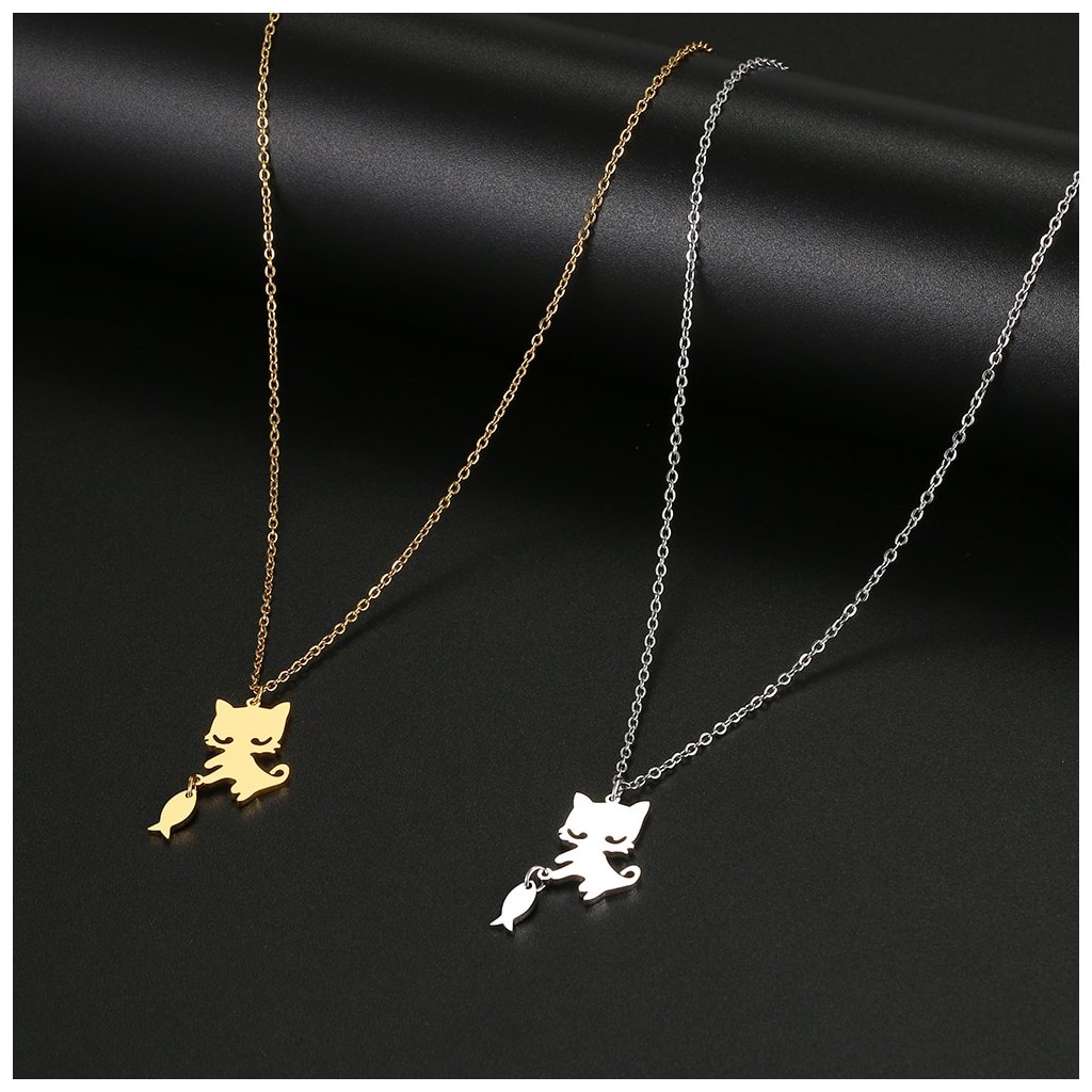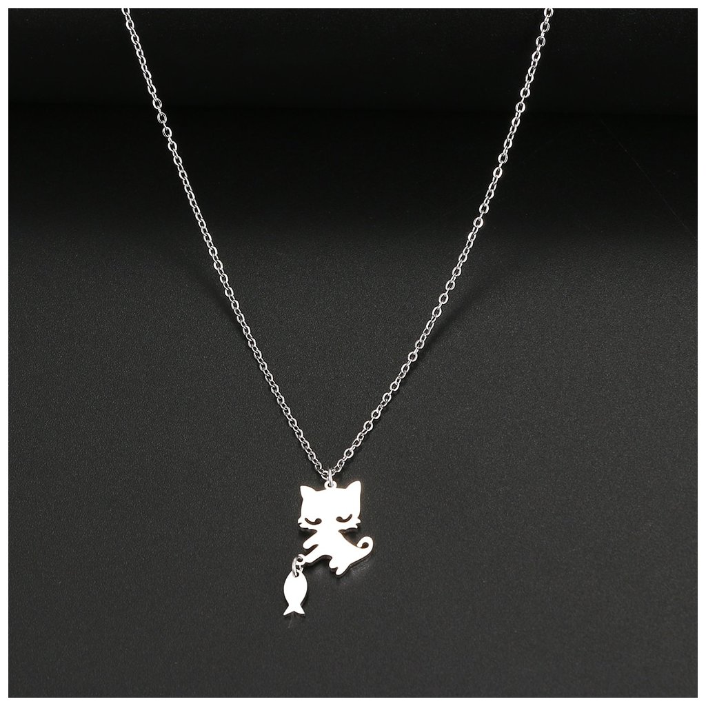 Řetízek s přívěskem - kočka s rybičkou, stříbrná ocel
