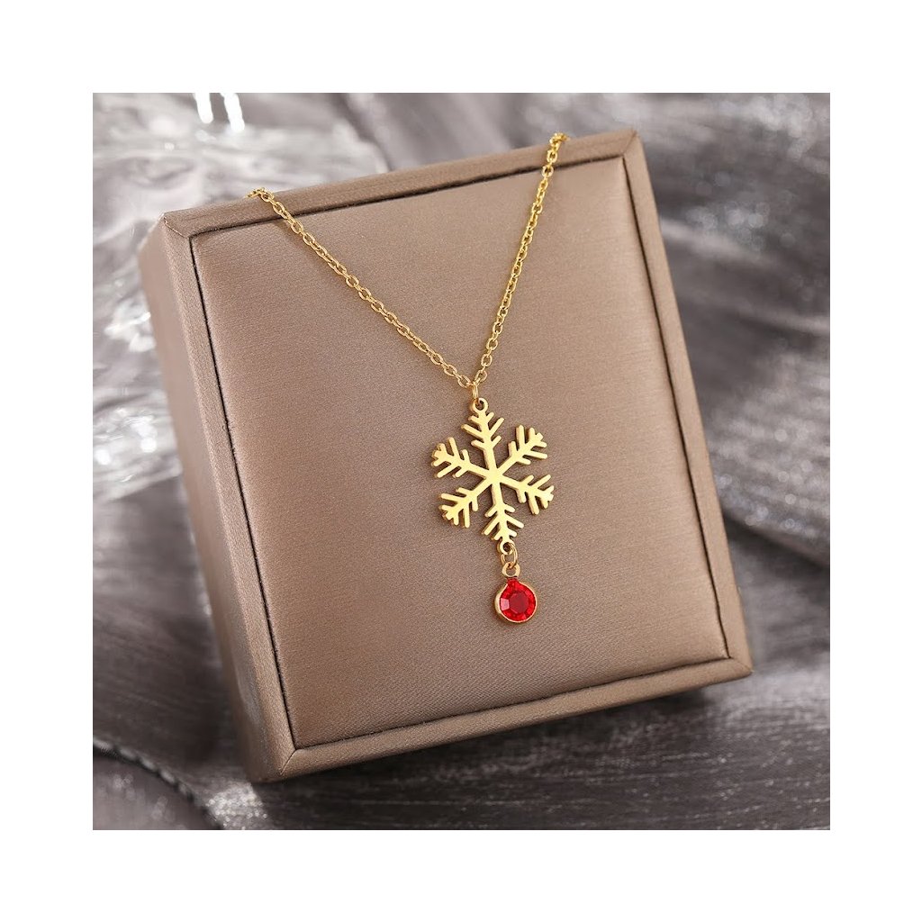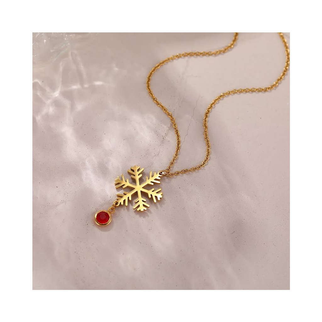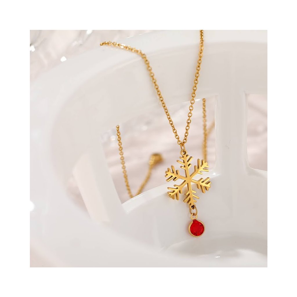 Řetízek s přívěskem - sněhová vločka s červeným kamínkem, zlatá ocel