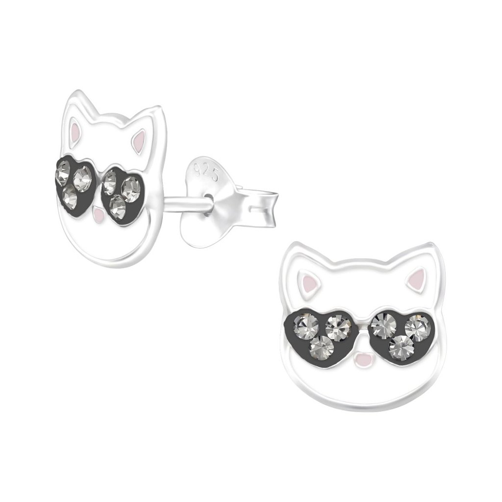 Dětské stříbrné náušnice Kočičí hlava s krystalovými brýlemi