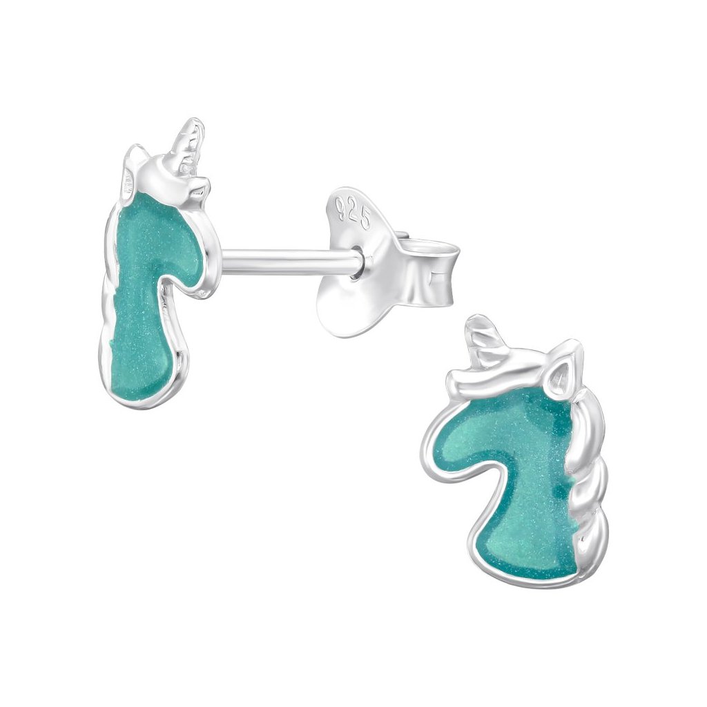 Stříbrné náušnice ve tvaru jednorožce, určené pro děti, jsou potažené E-coatem a vyrobené z epoxidu. S rozměry 6 × 8,7 mm a zapínáním na puzetu představují kouzelný a hravý doplněk, ideální pro malé milovnice fantasy.