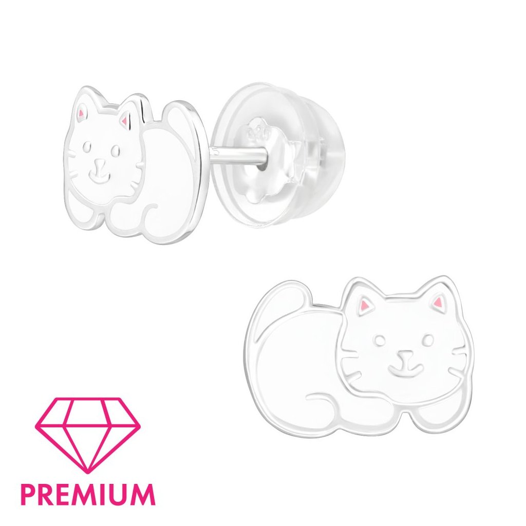 Stříbrné náušnice ve tvaru kočičky pro děti, potažené E-coatem, jsou vyrobené z epoxidu a mají rozměry 9,3 × 6,5 mm; s zapínáním na puzetu představují roztomilý a hravý doplněk, ideální pro malé milovnice koček.