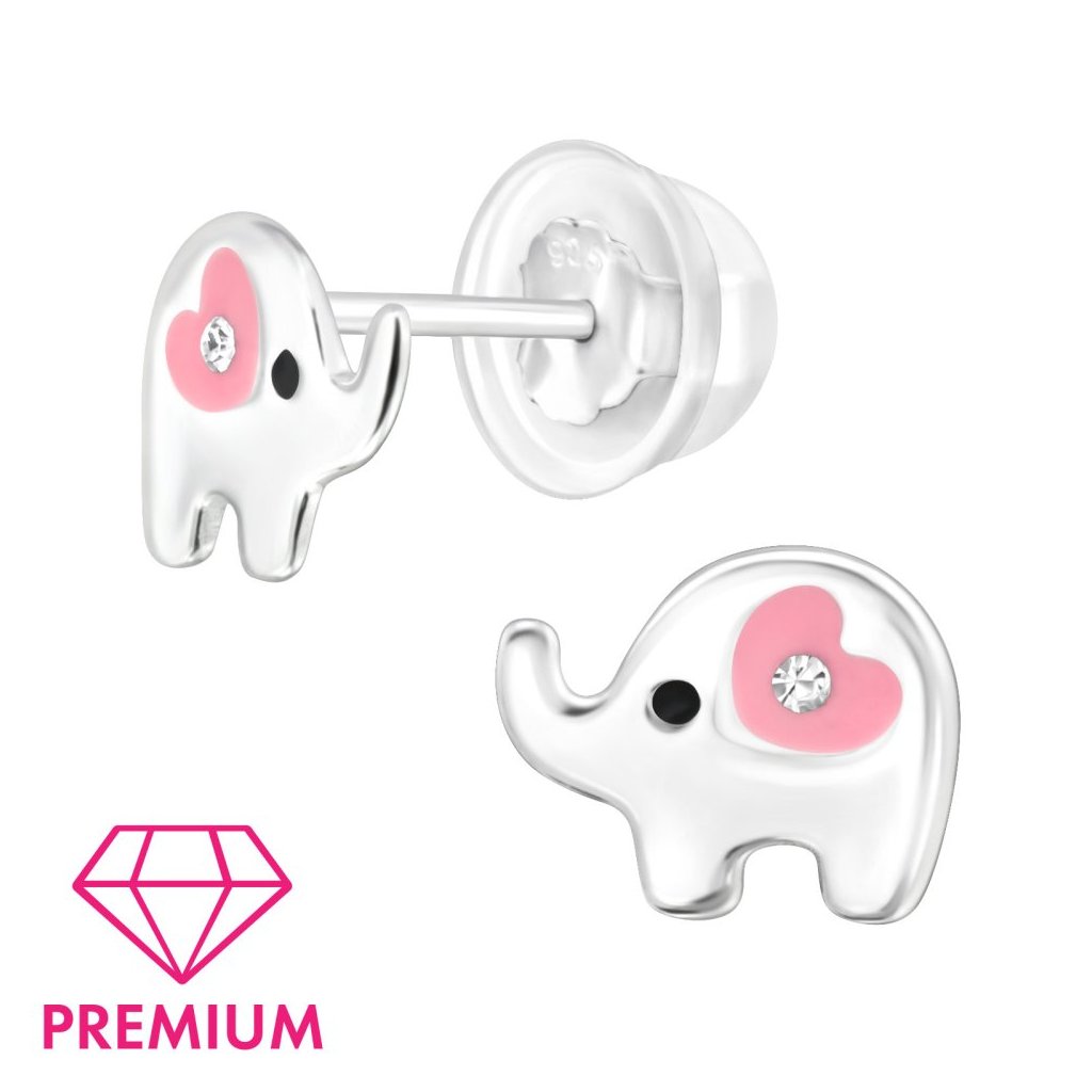 Stříbrné náušnice ve tvaru sloníka pro děti, potažené E-coatem, jsou zdobeny čirým Krystalem a epoxidem; s rozměry 8,3 × 6,5 mm a zapínáním na puzetu představují roztomilý a hravý doplněk, ideální pro malé milovnice zvířat.