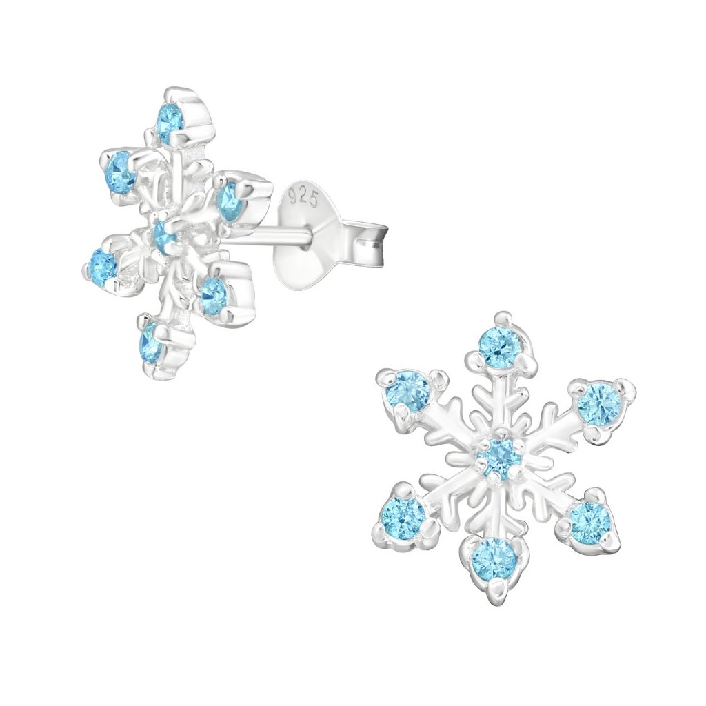Stříbrné náušnice ve tvaru sněhové vločky, určené pro ženy, jsou potažené E-coatem a zdobeny modrými kubickými zirkony (CZ). S rozměry 12 × 12 mm a zapínáním na puzetu představují elegantní a zimní doplněk, který dodá každému outfitu šarm a kouzlo.