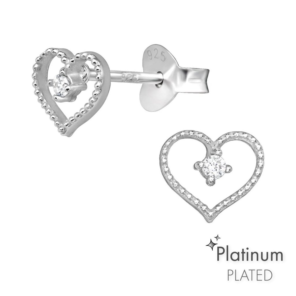 Stříbrné dámské náušnice ve tvaru srdce, lemované čirými kubickými zirkoniemi, vyrobené z kvalitní platiny. Náušnice mají rozměry 6,5 × 5,5 mm a jsou opatřeny puzetou pro pohodlné nošení. Tento elegantní design dodává šperku romantický a sofistikovaný vzhled, což je činí skvělým doplňkem pro každodenní nošení i speciální příležitosti. Díky jejich nadčasovosti se snadno kombinují s dalšími šperky a obohatí každý outfit.