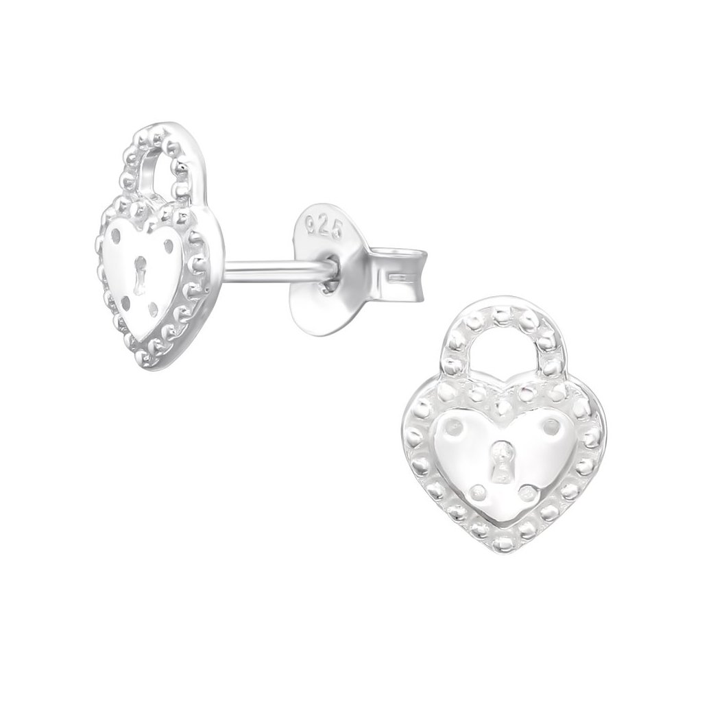 Stříbrné dámské náušnice ve tvaru srdce s motivem visacího zámku. Náušnice mají rozměry 6 × 8 mm a jsou opatřeny puzetou pro pohodlné nošení. Díky vrstvě E-coat jsou chráněny proti poškození a zachovávají si svůj lesk.