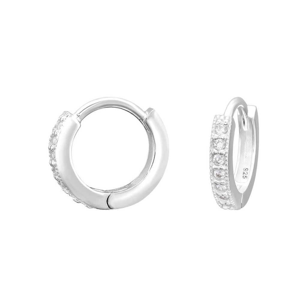 Dámské stříbrné náušnice ve tvaru zdobeného kruhu s čirými kubickými zirkony (CZ). Velikost náušnic je 2,5 × 12 mm, což dodává šperku elegantní a nadčasový vzhled. Náušnice jsou pokryty kvalitním E-coat povrchem pro dlouhotrvající lesk a ochranu. Skvělý doplněk pro různé příležitosti nebo jako výjimečný dárek pro milovanou osobu.