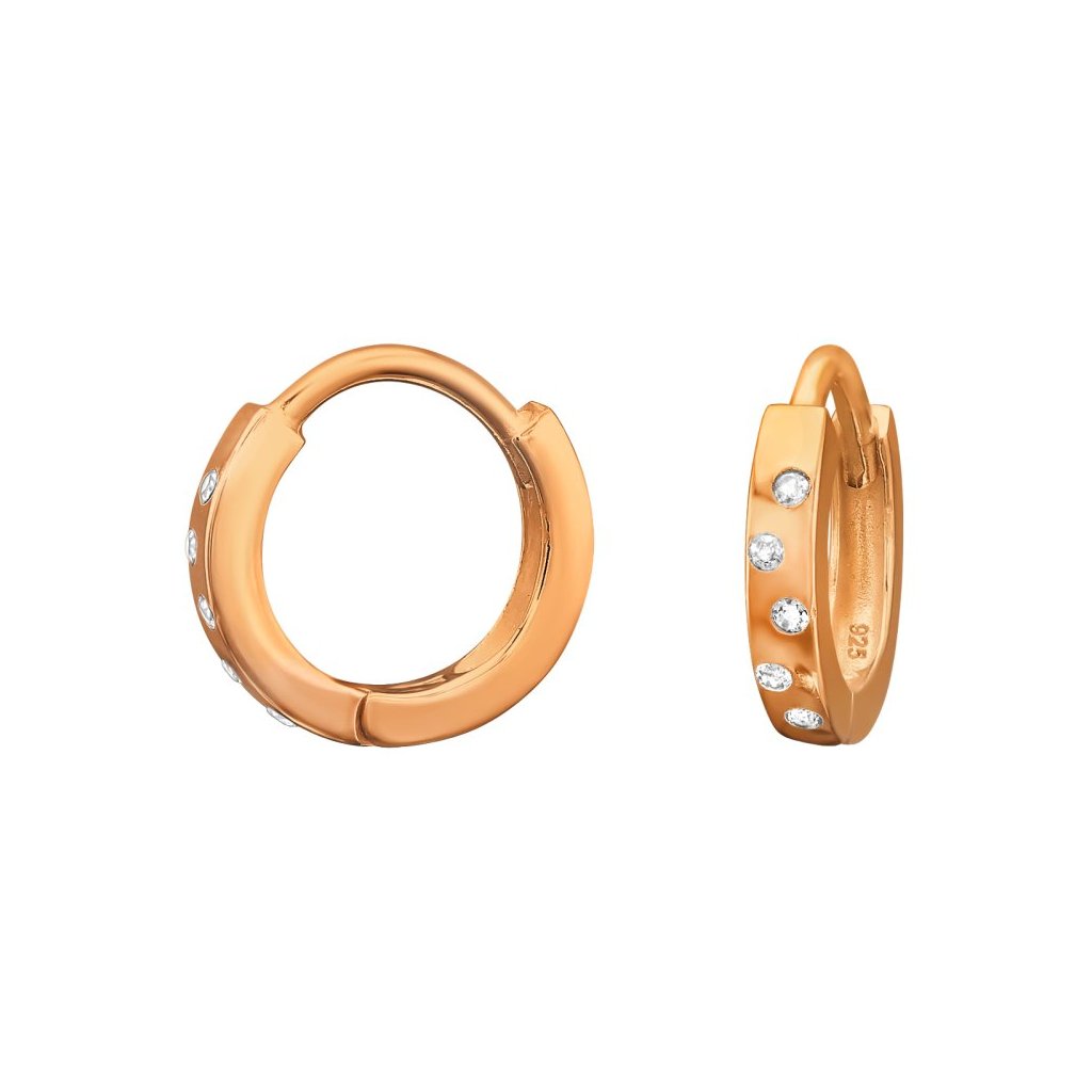 Stříbrné pozlacené náušnice obruč s kubickými zirkoniemi (CZ) jsou elegantním a moderním doplňkem pro každou ženu. Vyrobené ze stříbra s růžovým pozlacením a E-coat povrchovou úpravou, zajišťují odolnost a vysoký lesk. Náušnice mají rozměry 2,5 × 12 mm a jsou navrženy v kruhovém stylu, což dodává jejich designu jemnost a šarm. Tento kousek je ideální pro každodenní nošení i speciální příležitosti a skvěle doplní jakýkoli outfit.