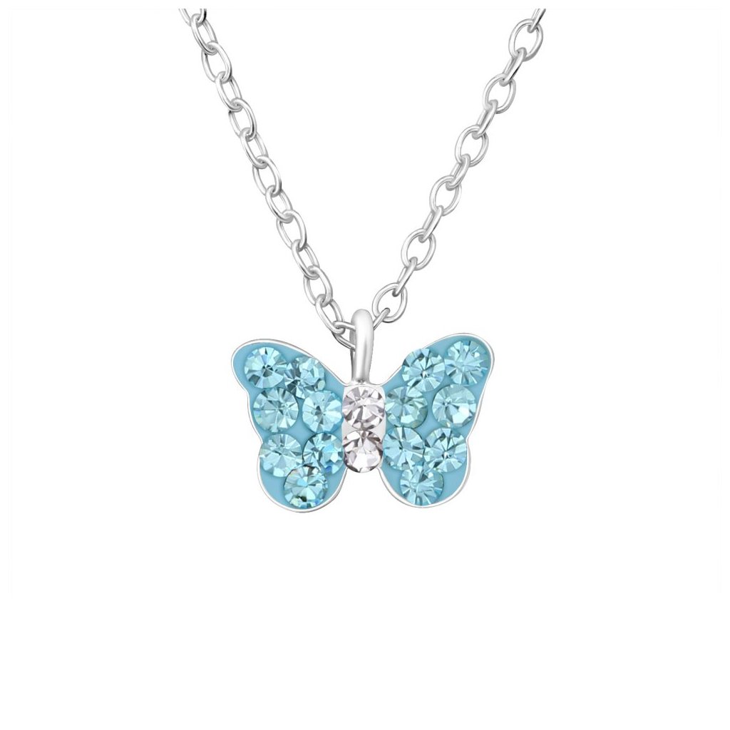 Dětský stříbrný náhrdelník Motýl – třpytivý klenot s kouzlem modrých krystalků