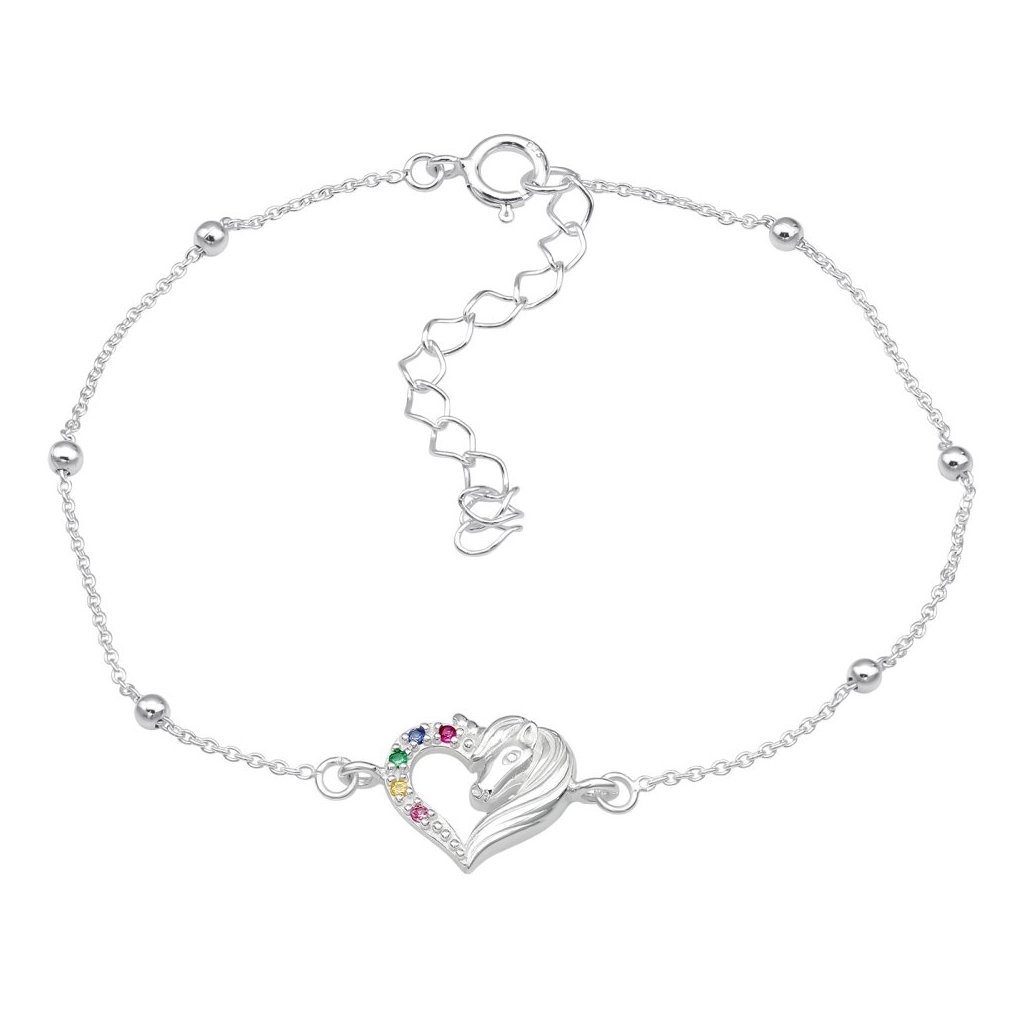 Stříbrný náramek s motivem jednorožce, určený pro děti, je potažený E-coatem a zdobený kubickými zirkony v červené, modré, zelené, žluté a růžové barvě; má délku 18,8 cm, tloušťku 1 mm a přívěsek o rozměrech 11 × 10 mm, což z něj činí veselý a hravý doplněk pro malé milovnice fantazie.