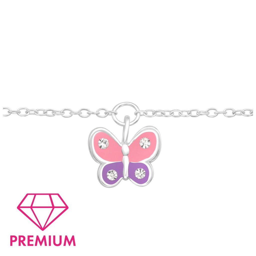 Stříbrný dětský náramek s motivem motýlka, zdobený čirým Krystalem. Náramek má délku 18 cm a šířku 1 mm, což zajišťuje pohodlné nošení pro malé slečny. Motýlek má rozměry 9 × 7 mm a přidává šperku hravý a jemný vzhled. Díky epoxidovému povrchu a vrstvě E-coat je náhrdelník chráněn proti poškození a udržuje si dlouhotrvající lesk. Tento náramek je ideálním doplňkem pro každodenní nošení i speciální příležitosti.