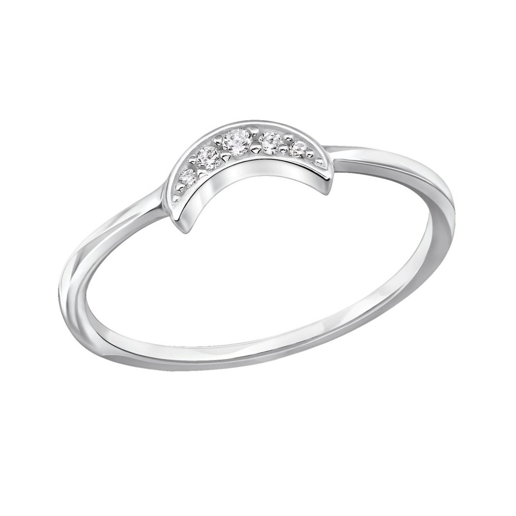 Stříbrný prsten ve tvaru půlměsíce, zdobený kubickými zirkony, s povrchovou úpravou E-coat, vyrobený z ryzího stříbra 925/1000.