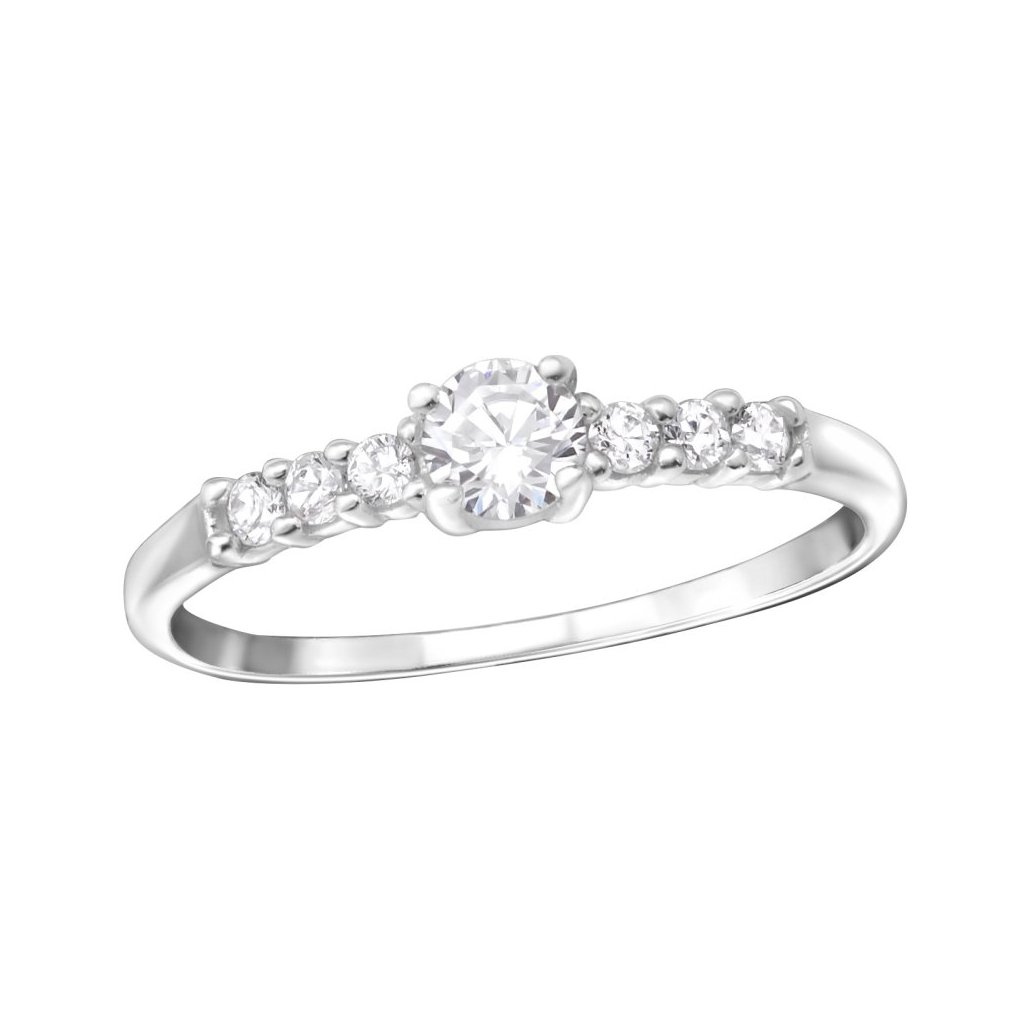 Stříbrný prsten s dominantním kamenem a šesti menšími zirkony, vhodný jako zásnubní. Vyroben z kvalitního stříbra 925/1000 s povrchovou úpravou E-coat.