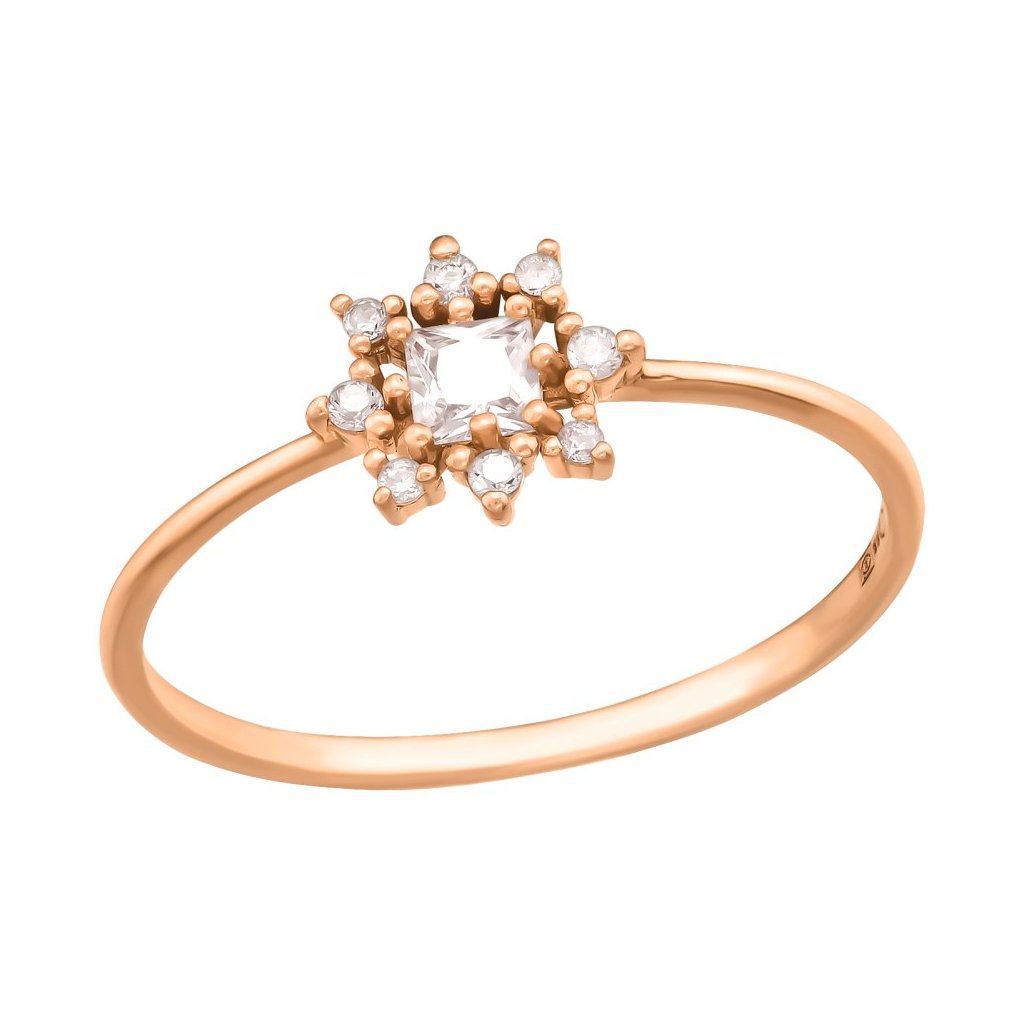 Středový kámen má rozměry 8 × 7 mm a jeho jasná čirá barva krásně kontrastuje s jemným růžovým pozlacením. Povrchová úprava E-coat zajišťuje dlouhotrvající ochranu prstenu před opotřebením a udržuje jeho krásný vzhled.