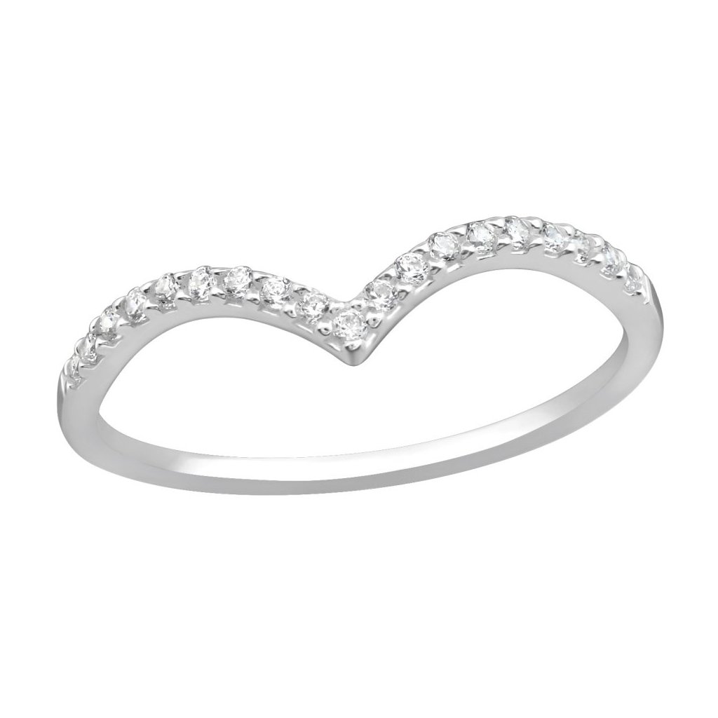 Stříbrný prsten s 19 kubickými zirkoniemi, tvar připomíná zaoblené písmeno V nebo vrchní část srdce, s povrchovou úpravou E-coat, ryzost 925/1000.